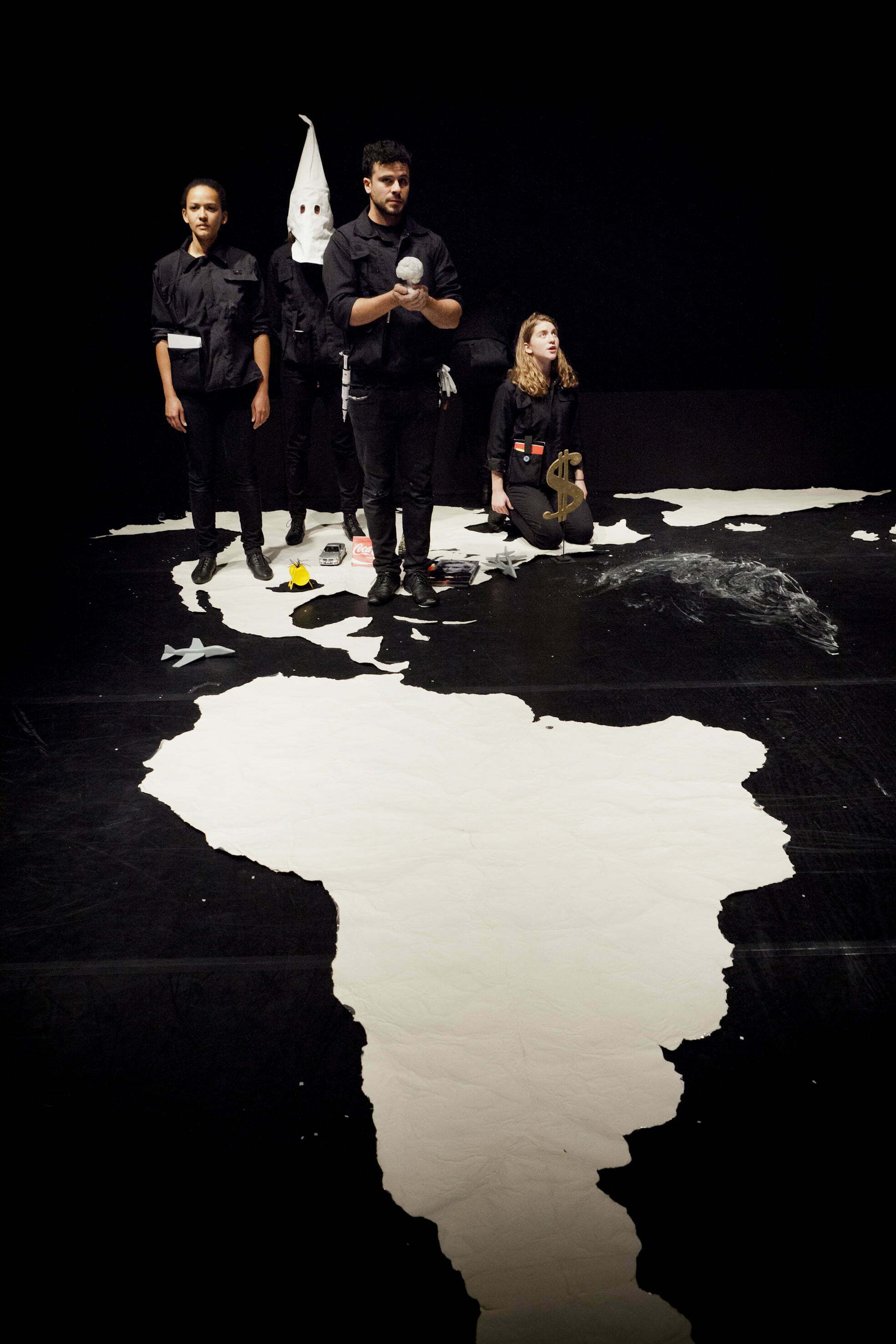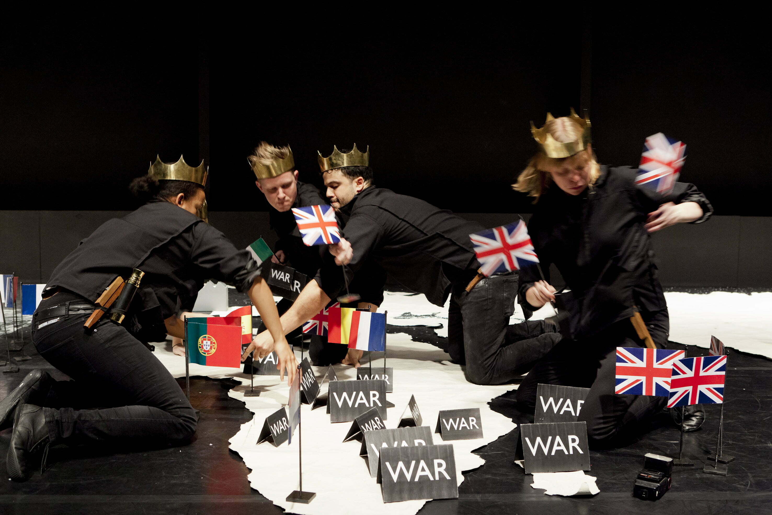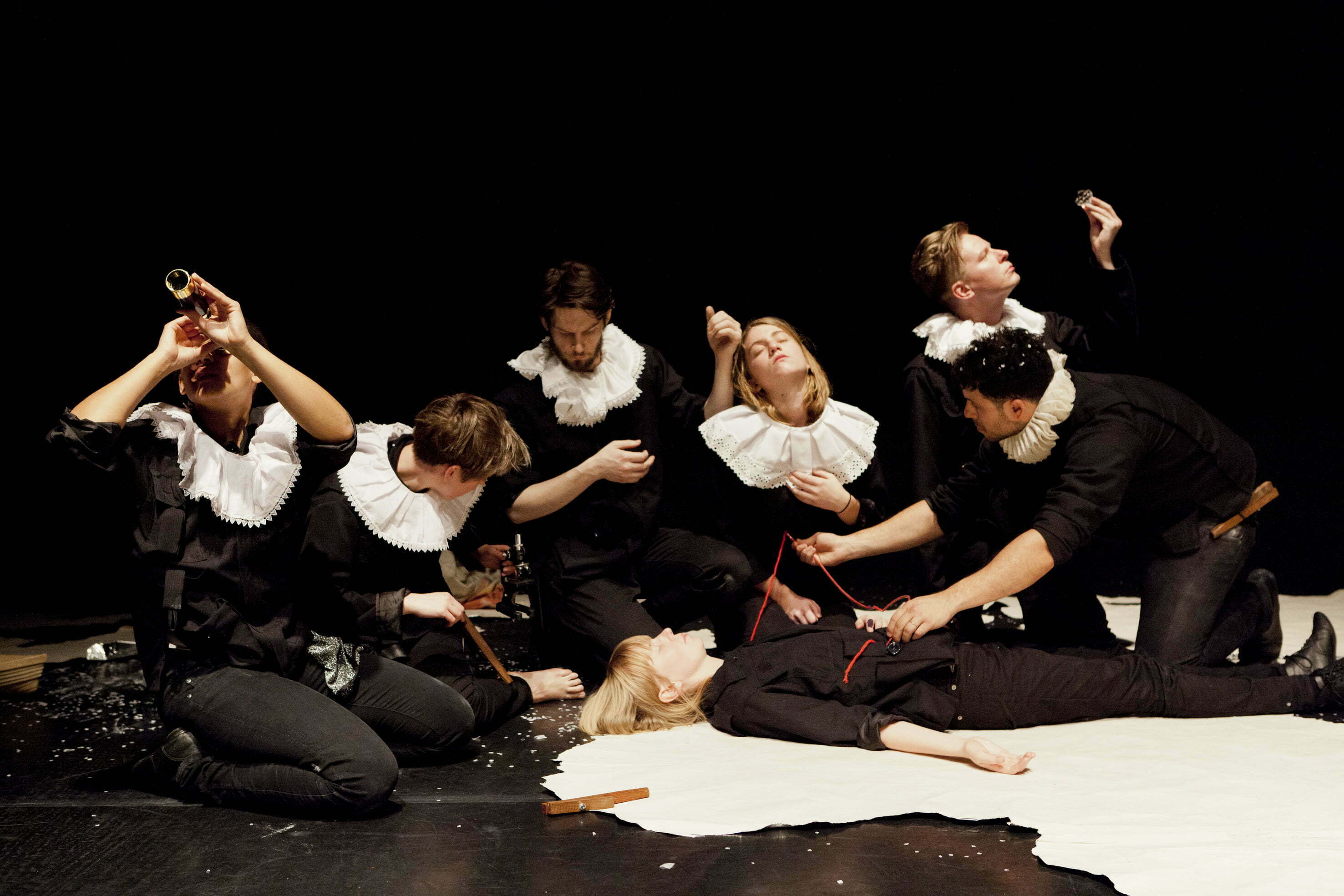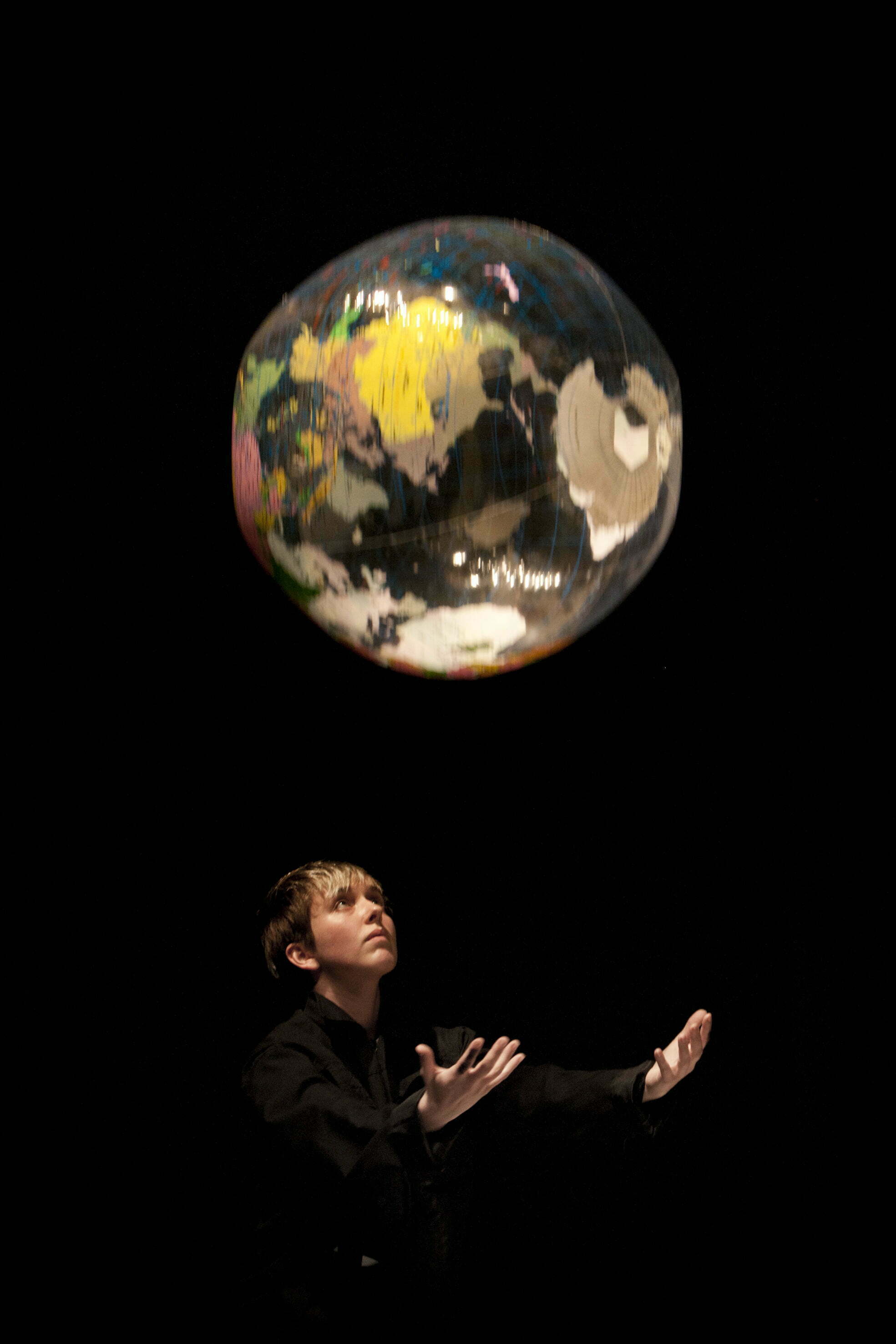 Over the years, the folks at Chicago Shakespeare Theater have searched the world to find unique theatrical experiences for their Chicago audience. They found the Belgium’s Ontroerend Goed, who, together with Sydney Theatre Company, have created one of the most innovative performance art pieces in many years! A History of Everything is a 100 minute, seven cast members, stunning stage presentation of the history of the world– told with a twist. The opening monologue states that scientific discoveries of the past few years offers a new insight into the nature of the universe. Astronomers now believe that the universe is still expanding but that once it stops expanding, it will reverse itself thus allowing everything to change back in reverse. This concept is vividly played out in a black box stage using clever but simple props and video images. A large white map of the world covers the stage floor as the seven black clad actors tell the reverse story off the world from today (May 25, 2012 with reference to the Cubs-Pirates baseball game) backward showing and referencing pop culture as well as political events from today backward.