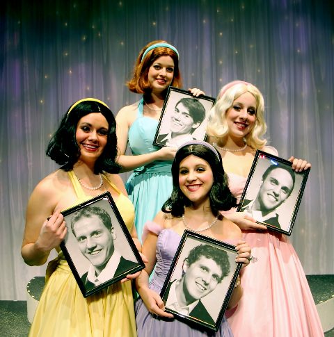Kaye (Meredith Bartmon), Peggy (Rebecca Cesario), Cheryl (Emily Senn) and Donna (Chloe Golden) are filled with expectation and excitement over their upcoming nuptials and open with such songs as “Mr. Sandman, Bring me a Dream,” “Everybody Loves a Lover,” and “Goin’ to the Chapel.” Their male counterparts — Chuck (John Debrowski), Frankie (Matt Falber), Johnny (Garrett Bruce) and Buddy (Andrew Oberstein), join them. The eight fine voices blend into strong harmonies. Each singer is also able take the lead in any particular song and can shift as smoothly with the lyrics as with the choreography. The fellows join the ladies for such winsome songs as “Put your Head on my Shoulder.” Ah, so romantic.