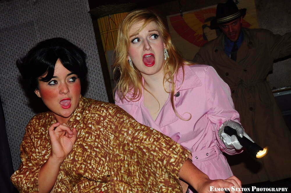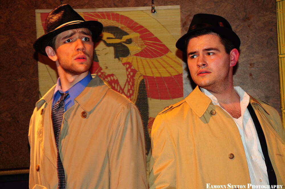 The story is sort of like a film-noir version of Comedy of Errors – instead of ever Plautus play rolled into one, it’s every noir hit rolled into one. The Maltese Falcon, Casablanca, various early Hitchcock . . . . There are five people, waiting around in Macao for something to happen. Rick Shaw (Johnny Kyle Cook) is a night club owner à la Rick’s Café Américain; he meets the helpless dame, Lureena Jones (Stephanie Souza), and lets her sing in his club; this ousts the old singer, Corinna (Lena Dansdill), the drugged-up and dangerous femme fatale; Mitch Boonton (Jordan Phelps), the tough, stand-offish American modeled on Chandler’s Marlowe, is searching for a man named McGuffin, who framed him for murder; and the native Tempura (Nico Nepomuceno) assists those who ask when it suits him. The plot’s paper-thin – and it’s supposed to be. The songs are good, the book cornball as anything and really quite funny.