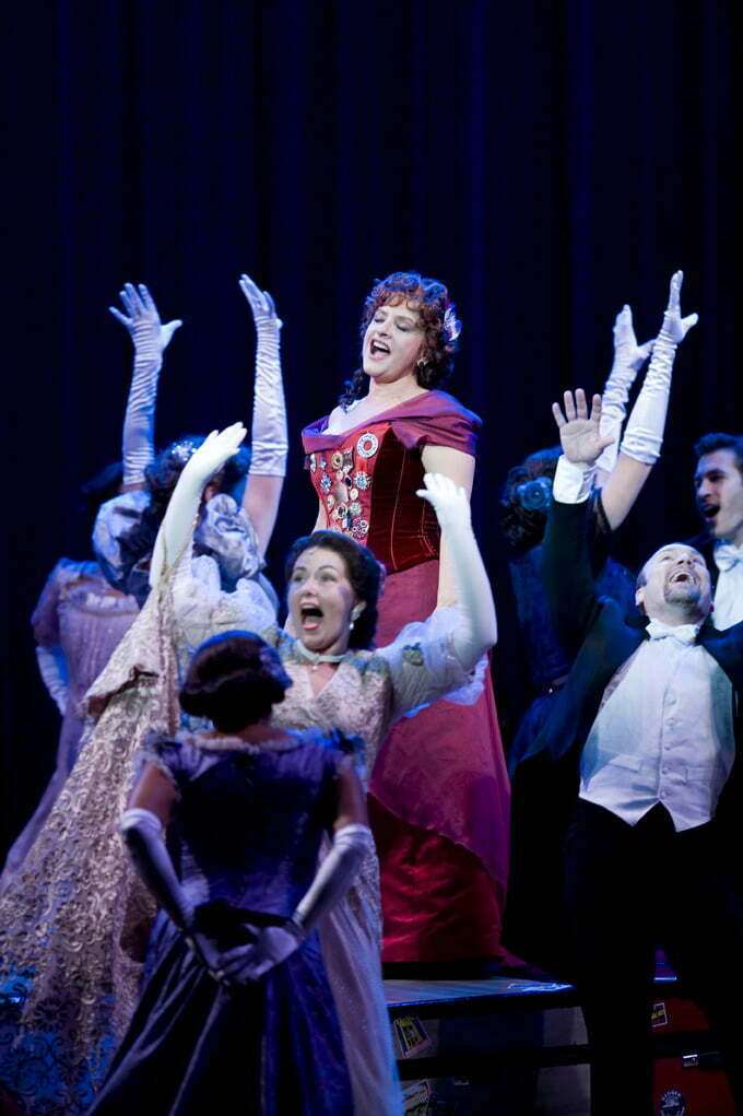 The core of the show’s energy came form the strong supporting cast led by the Michael Weber’s exuberant Charlie Davenport, the Wild West show’s manager. Weber, George Hearn (Buffalo Bill) and Michael Accardo (Wilson/Pawnee Bill) deftly landed the show’s tribute to show biz with their wonderful “There’s No Business Like Show Business.” Weber almost stole the show. Joseph Anthony Foronda (Sitting Bull) and Suzanne Sole (Dolly Tate) did yeomen work also.
