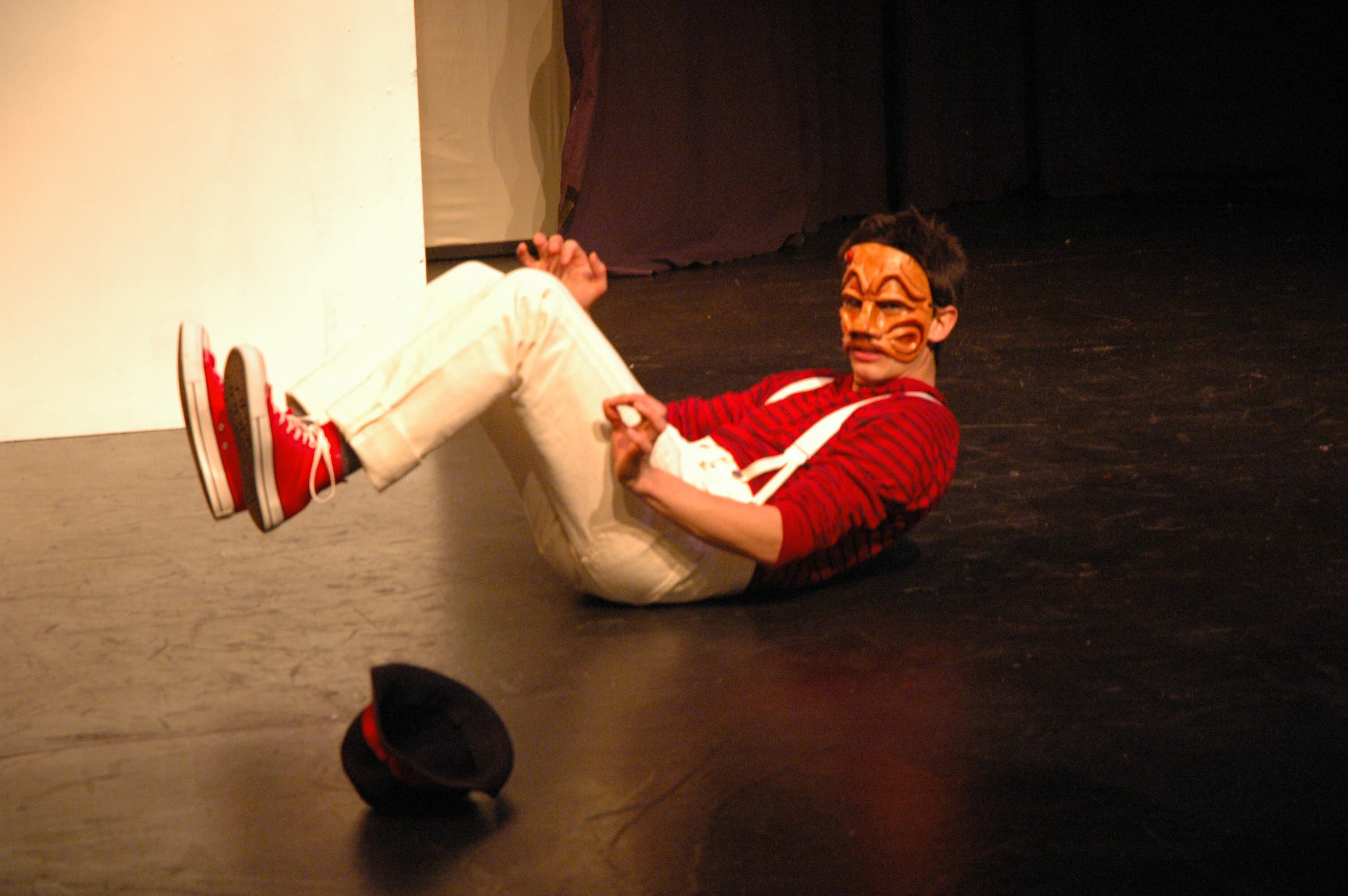 The journey of the play begins within a question: Arlecchino enters theOmen Sade Filament Theatre Ensemble Chicago stage, and asks if he can tell a story.  He then recounts, with the physicality of a Warner Brothers cartoon character and the help of musician/foley artist Spearen, his life in the city, his travels to London, Rome, and Amsterdam, and the lessons he learns along the way.  It is sweet, humorous, fanciful, physical, and very fun.  Sade is impressive.  He’s sweating by the end of the show, and with good reason.  And although this is undeniably a modern show, he pays very close attention to, is indeed very strict in his interpretation of, the harlequin character he portrays.  He is acrobatic to the point of obfuscating his movements (he can never simply put his hat on: he has to flip it from his foot onto his head); he never has enough to eat or drink; and he indulges in carnal pleasures when the opportunity arises.
