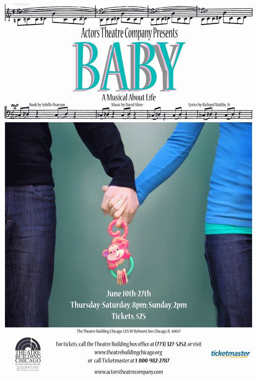 Actors Theatre Company has been around for 14 years and yet, many of us, in Chicago, have not had the pleasure of watching this non-Equity troupe “do their thing”. Well, now you can see the talent that they bring to us in their production of “Baby” a musical with a book by Sybille Pearson, music by David Shire and lyrics by Richard Maltby,Jr. “Baby” is the story of three couples on a college campus- One couple, Alan and Arlene are married with three grown daughters, a second married couple, Pam and Nick are on the staff ( as is Alan) of the college and are anxious to have a child and the third couple, Lizzie and Danny are students who are not planning that far ahead. This story takes on a rollercoaster ride with each of these couples as they explore what a baby will mean to their lives and the changes (not just the diapers) that will come as well.