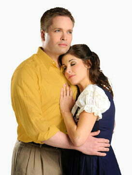 The groom, Charles (Brandon Moorhead) and the men sing the rousing dance tune “I’ll Go Home with Bonnie Jean.” After the love-starved American, Tommy (the golden-voiced Robert Hunt) and the sensual Fiona flirt producing sparks, they sing the enchanting romantic “The Heather on the Hill’ that affirms their mutual interest.