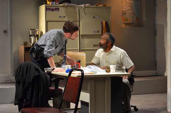 Veteran Assistant Cook County States Attorney Jim Lynch has penned an intense and unpredictable police procedural play that  reminds one of Keith Huff’s A Steady Rain but CCX, in its world premiere, focuses on detectives rather than patrol officers. Lynch, whose Irish play – The Tallest Man – was a polished and telling look at rural Ireland, once again demonstrates his storytelling and character development abilities. Lynch is a true seanchaí (storyteller) in that fine tradition. In a tight, flowing and intense production directed by Patrick Thornton, CCX finds two veteran Chicago Police detectives from Area 4  (the tough gang-infested West Side of Chicago) as they bring in an adult gang-banger and drug dealer for a street shooting that results in murder.