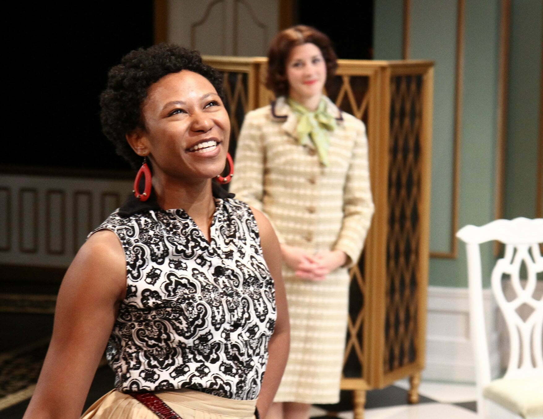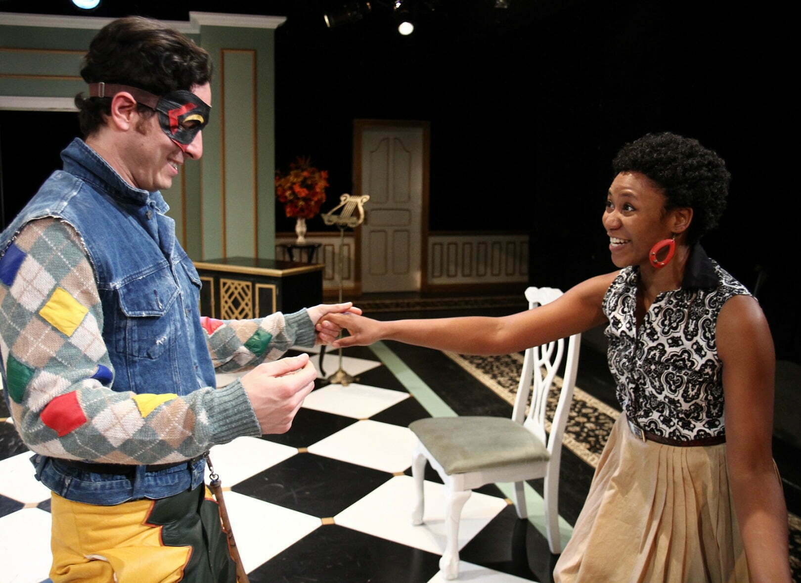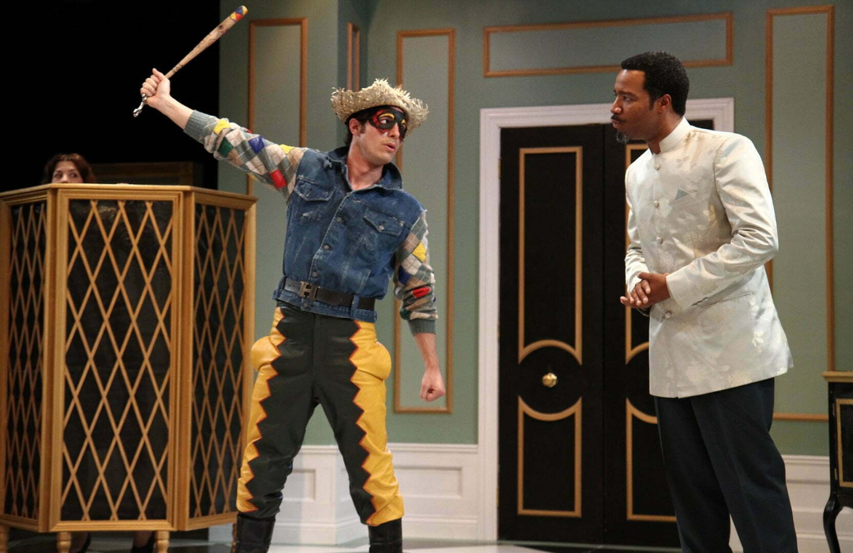 And that’s sort of the story with this production. The actors commit wonderfully to direction that’s sort of half-baked. Director Timothy Douglas (who’s Remy Bumppo’s artistic director starting this season) has set this play in 1960s Chicago as a sort of parable of dating outside your class. The Prince is wealthy, cocksure, a downtown-living kind of guy; Silvia is from the South Side, African-American and poor. The problem is, you wouldn’t really know that unless you read the program notes. Yes, you’d figure out it was the 60s – the music and the costumes (designed excellently by Lena Sands) would clue you in. But it seemed like Douglas was afraid to go whole-hog on his decisions of time and place. Yes, it’s the 1960s; yes, it’s Chicago. But the consequences of racial strife are more evident in the program than on stage. Douglas did not emphasize the class and racial differences enough. Silvia was undoubtedly a strong, black woman; but she was a strong woman first. The racial undercurrents Douglas wanted to emphasize did not come through. Part of me wishes she’d been portrayed as a Black Panther – because what stronger symbol of Black Power in America is there, except for maybe the fact that an African-American is now our President? (And I like to think this is more than my fondness for the Panthers speaking.) It’s definitely relevant to the era. But Douglas didn’t want to deal with the harshness and contentiousness that would have resulted in such a decision. At least, that’s how I feel. He wanted his notes to stand in for the substance on stage. Also, the decision to play Harlequin as a Spaniard was a bit odd. Don’t get me wrong, as I said, I thoroughly enjoyed Gamoa’s performance. But if Silvia is from the South Side – if this is supposed to be an interpretation of a play seen through racially tinted eyes, and Harlequin is from the same village as Silvia – why wasn’t Harlequin black? I had to ask myself – and I’m sorry, but I have to acknowledge this crossing my mind – if a black man playing the feast-gorging, alcohol-loving buffon would be seen as unacceptably racial. Racism has always been a part of America. It did not go away in 2008 and anyone who tries to say otherwise is fooling themselves. So, contextually, why wasn’t the clown black? And Spanish is an odd choice even outside this context: Commedia is distinctly Italian, and this is a French play. So what is a Spaniard doing in the South Side of Chicago?