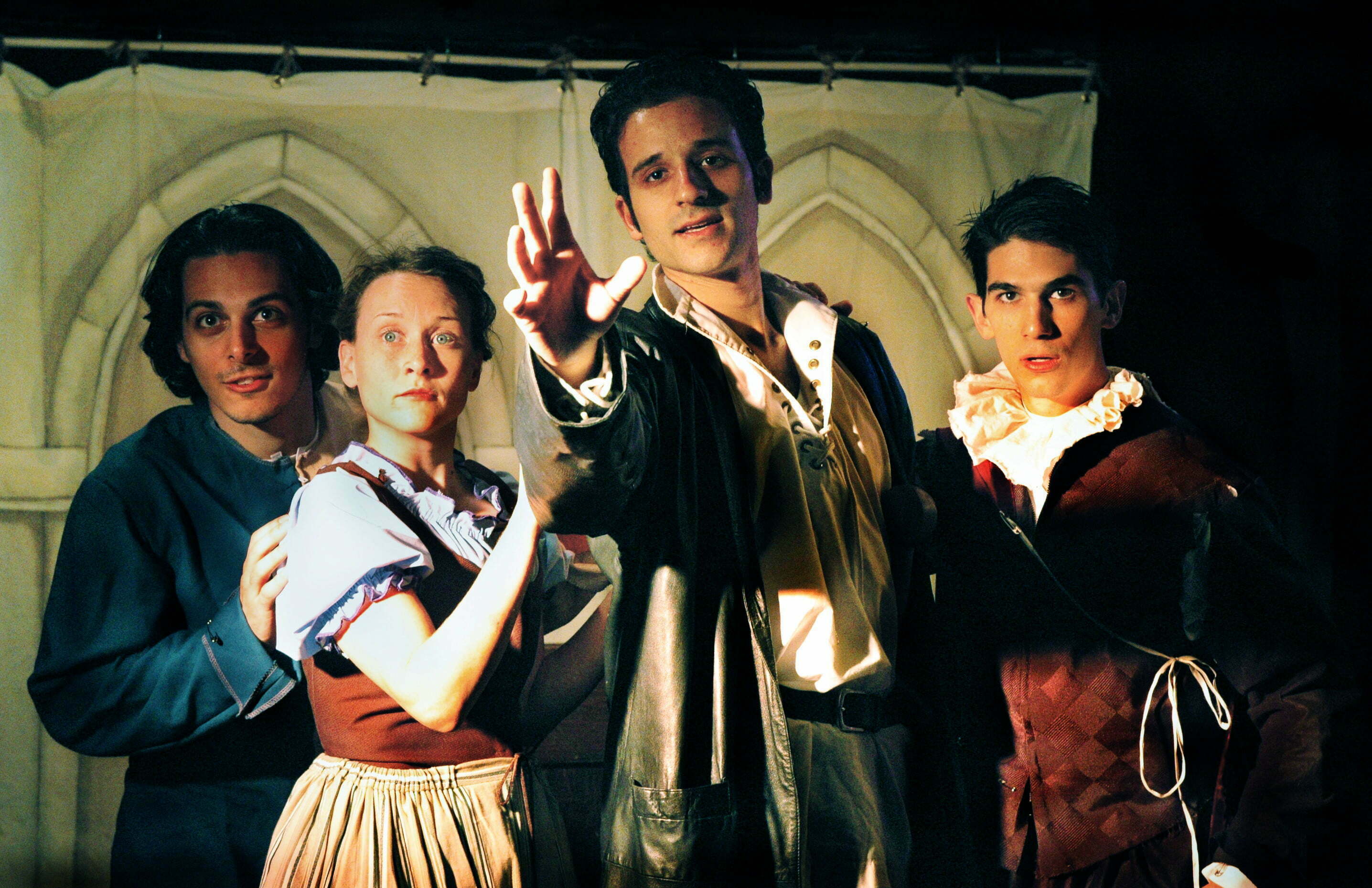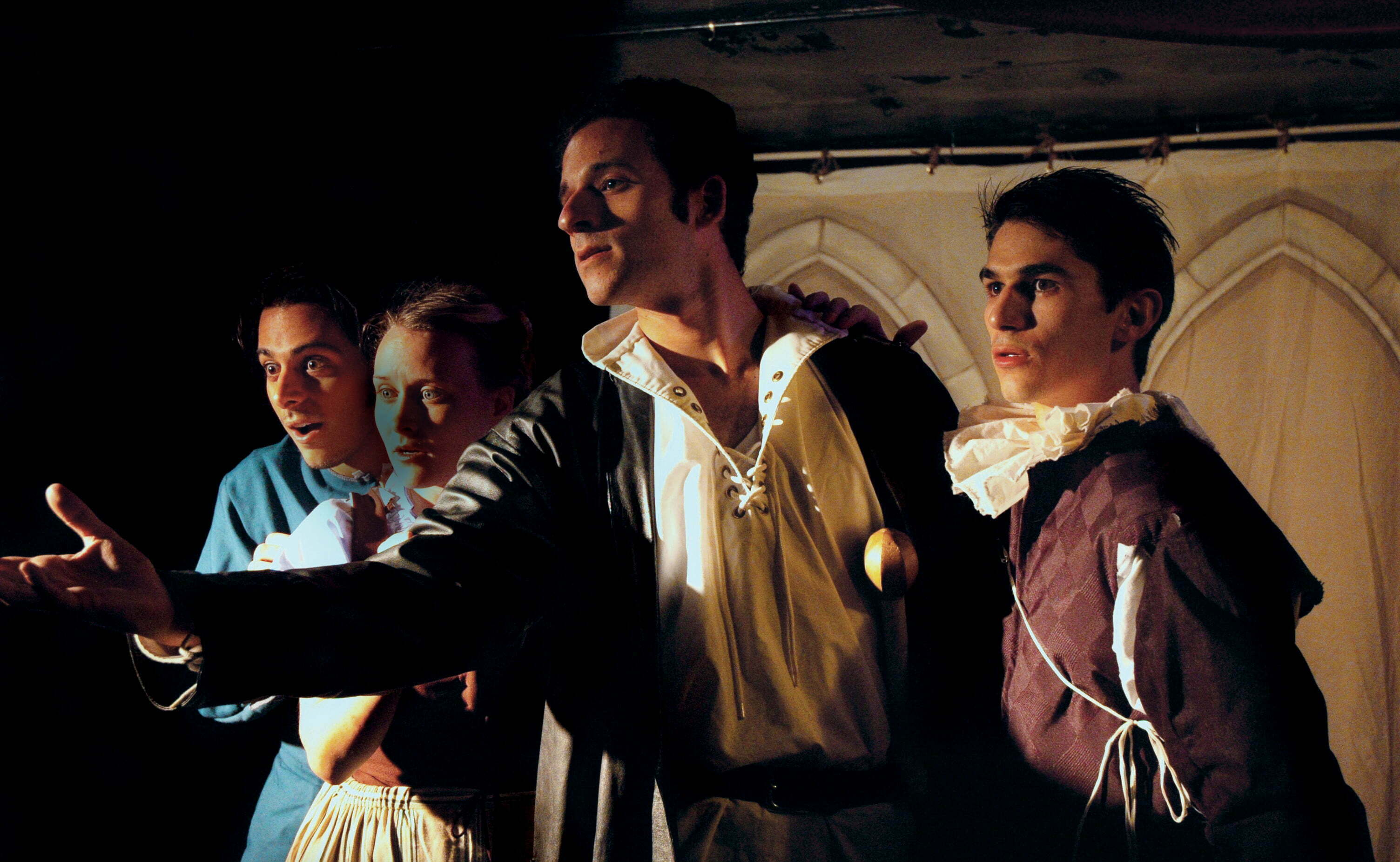 Director Julie Ritchey has prepared her cast to play multiple scenes depending on what the audience “chooses” as her intelligent show utilizes the “Choose Your Own Adventure” format. The players – Marco Minichiello (Dromio), Ped Naseri (Antonio), Omen Sade (Bernardo) and Mary Spearen (Rosalind) start the show with a hilarious blend of familiar Shakespearean quotes, quips and short speeches while warming up the audience with their articulation and acting chops, with some ad libs and funny physical comedy with improv and commedia del’Arte influences.
