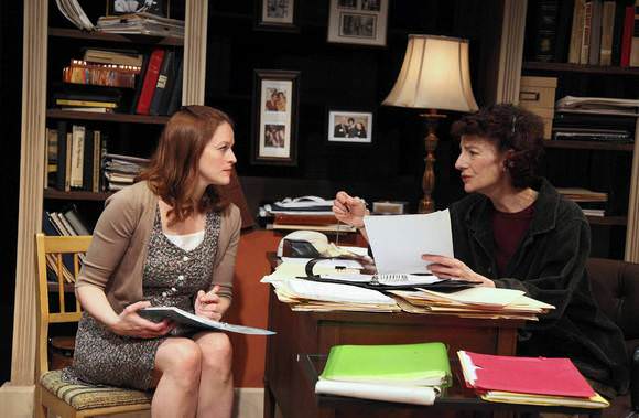 Playwright Donald Margulies has much experience teaching at Yale University. His 1997 Collected Stories is a gem of a two-hander that give a seldom mentioned twist to the standard mentor-protege format. Here Margulies finds Ruth Steiner (Carmen Rpman), a celebrated New York author with a dry wit and a fine writing resume who live alone while teaching writing at a major university. Her place, nice book-lined set designed by Sarah E. Ross, is where she hosts one-on-ones with her students. When the vivacious and highly motivated aspiring student writer, Lisa Morrison (Gwendolyn Whiteside) arrives for a meeting, Lisa so impresses Ruth that she hires Lisa as her personal assistant.