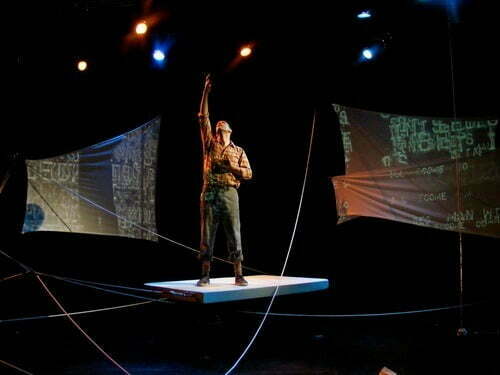 Jeremy Sher’s one person work, Crow, both written and staring Jeremy Sher is set in 1969 depicting a round-the-world solo sailboat race that finds Donal Crowhurst’s adventures being vividly presented. Utilizing innovative video (by Liviu Pasatre) and excellent sound (by Lee Keenan) on a yacht infused set complete with white sails and 1200 feet of sailors rope, Sher’s 75 minute one-act is a vague, unfocused and confused story told in flashbacks in no particular order. The most engaging thing in Crow is the use of sailing ropes that Sher deftly arranges from one clamp to another making a series of crossed rope formations hinting a sail ringings. I quickly got tired of watching Jeremy Sher move about the set as he tells his story while manically moving about suggesting the rigors of ocean sailing.