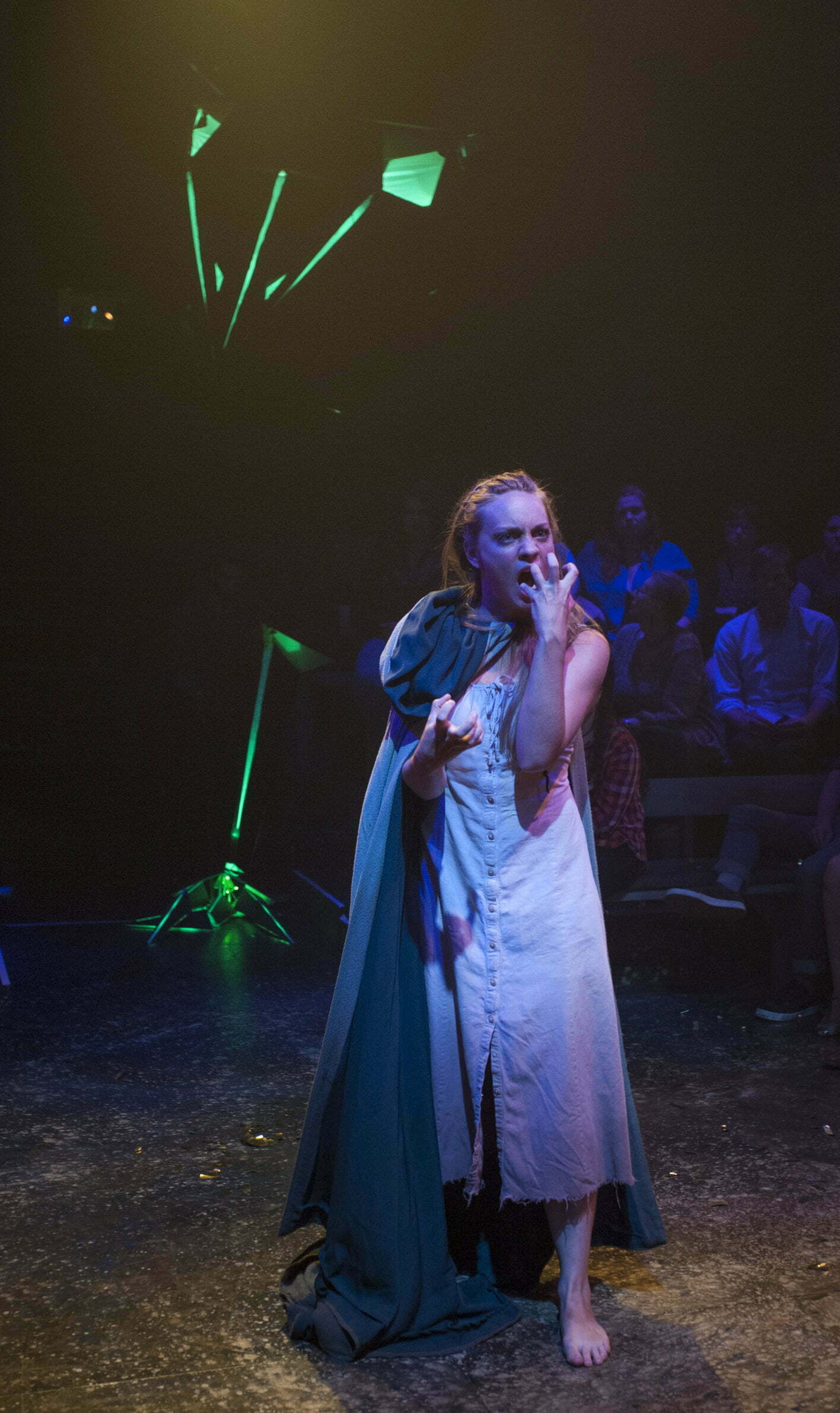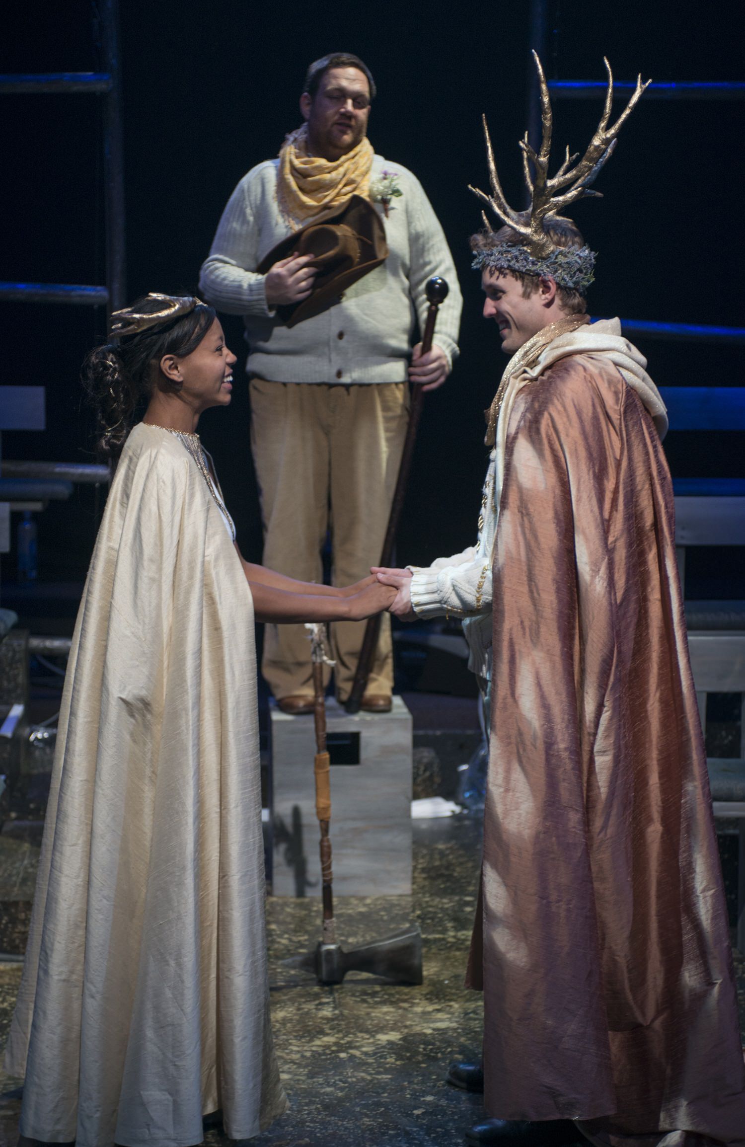 As I stated in my review of Part I: “Utilizing all the House stylistic elements including puppets, miniature models, strong lighting, unique costumes with ample sprinklings of humor, this story has richly layered storytelling that explores the nature of leadership, governance with the unique American struggle to balance personal liberty with actions for the common good of society.” That tradition continues in Part II, The Crownless King who now has a wife, Bienne Boilieu (Paige Collins).