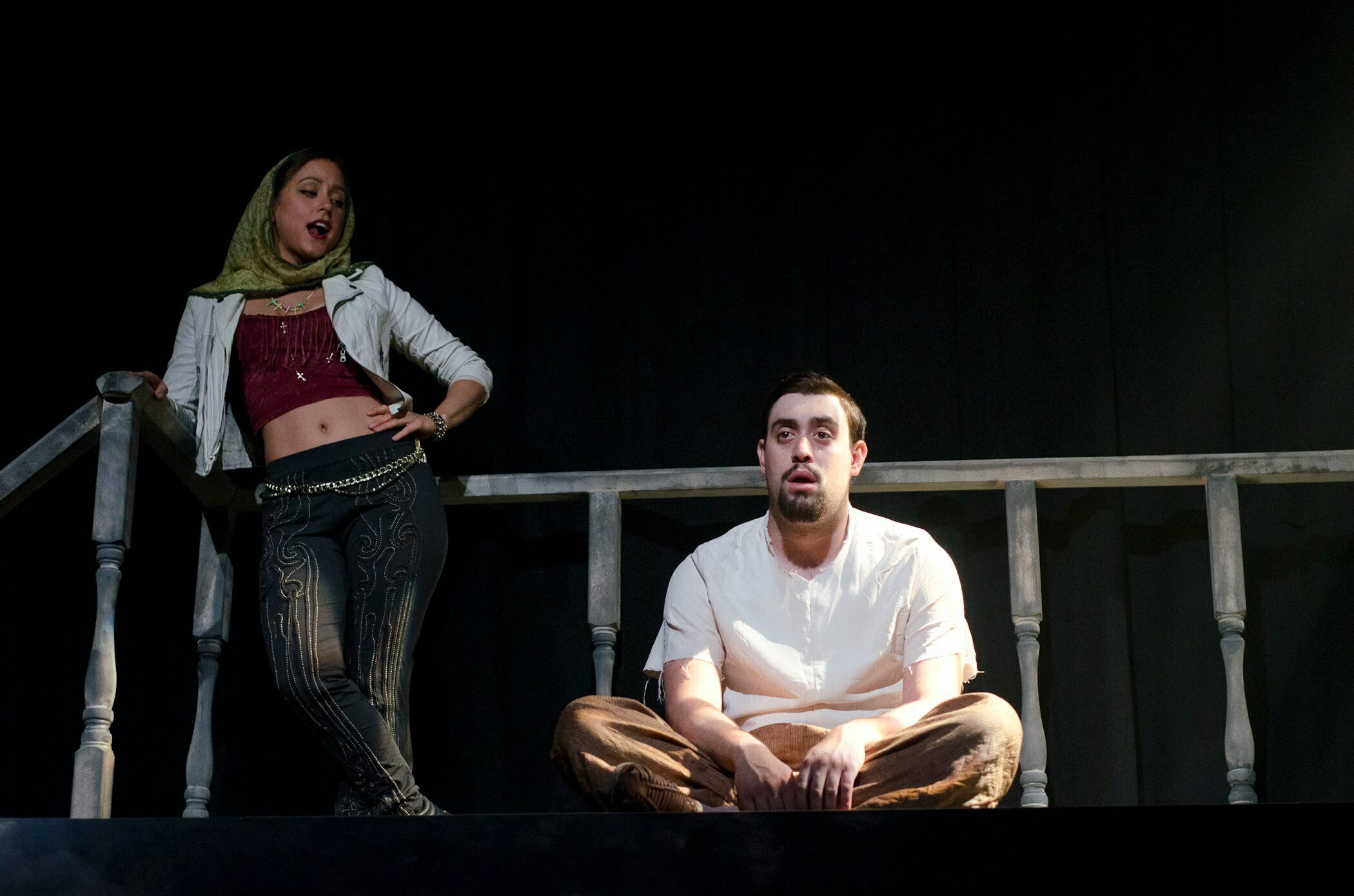 But several production flaws prevented us from ever getting into the flow of the production, First, the use of underscoring music was problematic. With actors speaking so lowly and racing through their words as of they were simply trying to get Guirguis’ dialogue out without understanding what they were saying, we fail to engage with the show. I simply could hardly hear Britney Coleman as the Angel nor Jessicia Maynard in her early monologue. It sure hurts a wordy play when we have trouble hearing and understanding the actors. Lack of volume and speech patterns that found actors racing through their lines hurt the show.