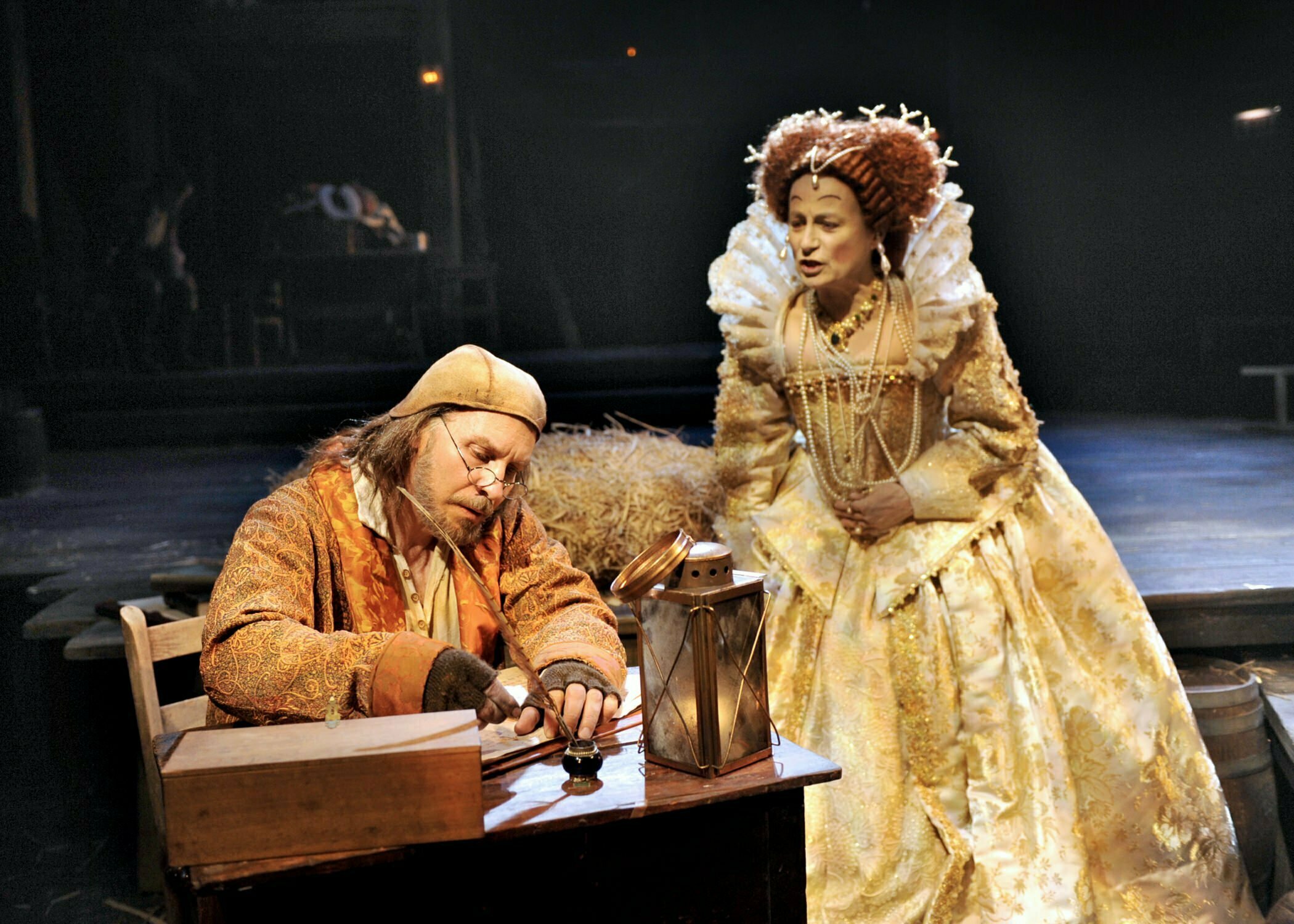 Set in England in 1601 in the barn of Queen Elizabeth I, Timothy Findley’s Elizabeth Rex dramatizes the role reversal debate between a sovereign queen who acts more like a man and a male actor who lives as a woman. Utilizing a realistic barn set (design by Daniel Ostling) and period perfect costumes (design by Mariann S. Verheyen), director Babara Gaines tape two Canadian actors to play the principal roles: Diane D’Aquila as Elizabeth I and Steven Sutcliffe as Ned Lowenscroft. Surrounding these tow brilliant players are a group of Chicago talents: Kevin Gudahl as William Shakespeare, Mary Ann Thebus as Kate Tardwell, Roderick Peeples as Luddy, Bradley Armacost as Percy, Eric Parks as Matthew and Matt Farabee as Harry and Brenda Barrie as Mary Stanley.