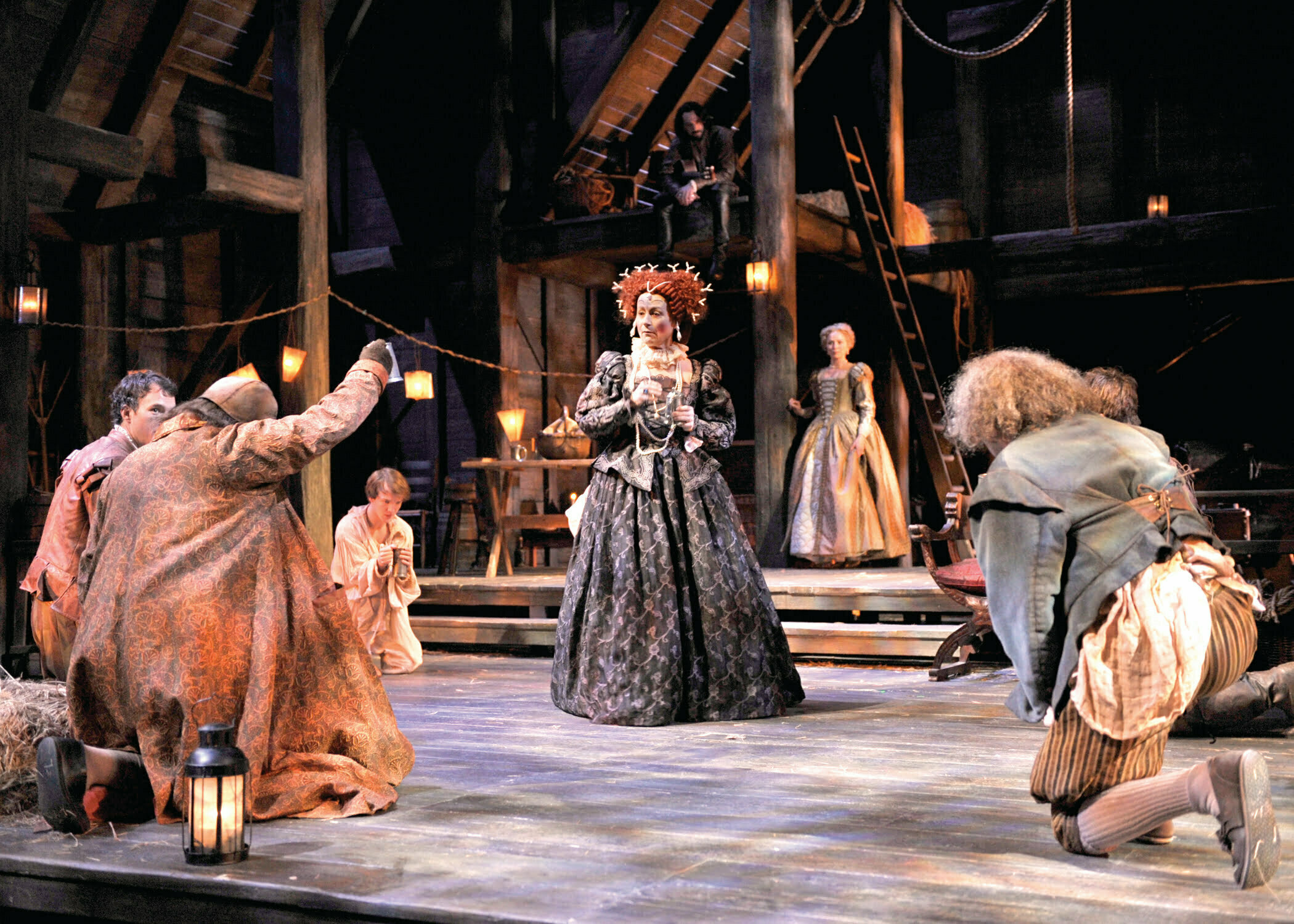 That simple summary thrives as we meet the quirky 17th Century thespians led by William Shakespeare (played understated by Kevin Gudhal) and the rag-tag actors that included a drunkard, an old man living in the past and a quirky seamstress and a dying actor more woman than man. When the queen arrives, Ned is her outspoken opponent since his eminent death from the pox allows him the freedom to say whatever comes to his mind. The debate rages on as the two engage in verbal debate. Elizabeth hides her female side as a mechanism for sovereign survival – ruling as a man works for her. Ned has played woman all his life in Shakespeare’s plays and as a gay man feels more comfortable as a woman.