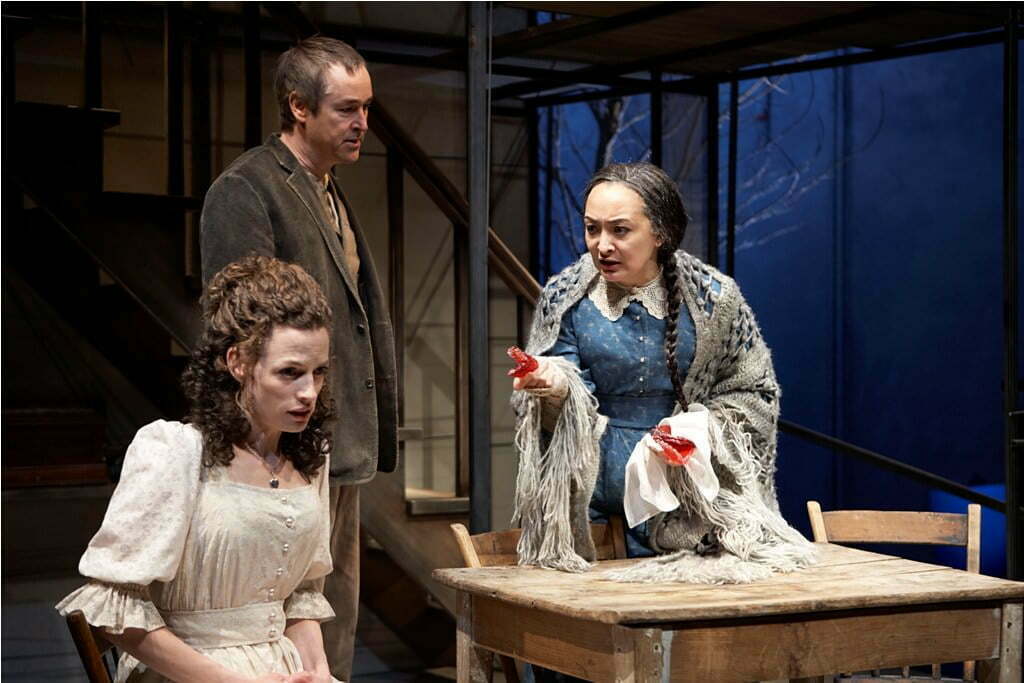 Edith Wharton’s 1911 novel, Ethan Frome, is reduced to a taunt 90 minute stage drama by Laura Eason now running at Lookingglass Theatre. This is a subtle and wrenching play revolves around surviving the bleak, cold and raw rural New England environment. Eason’s adaptation vividly depicts the effects of isolation, loneliness and interdependence on the inhabitants of snow-bound folks. The story is told by a third person narrator using flashbacks.