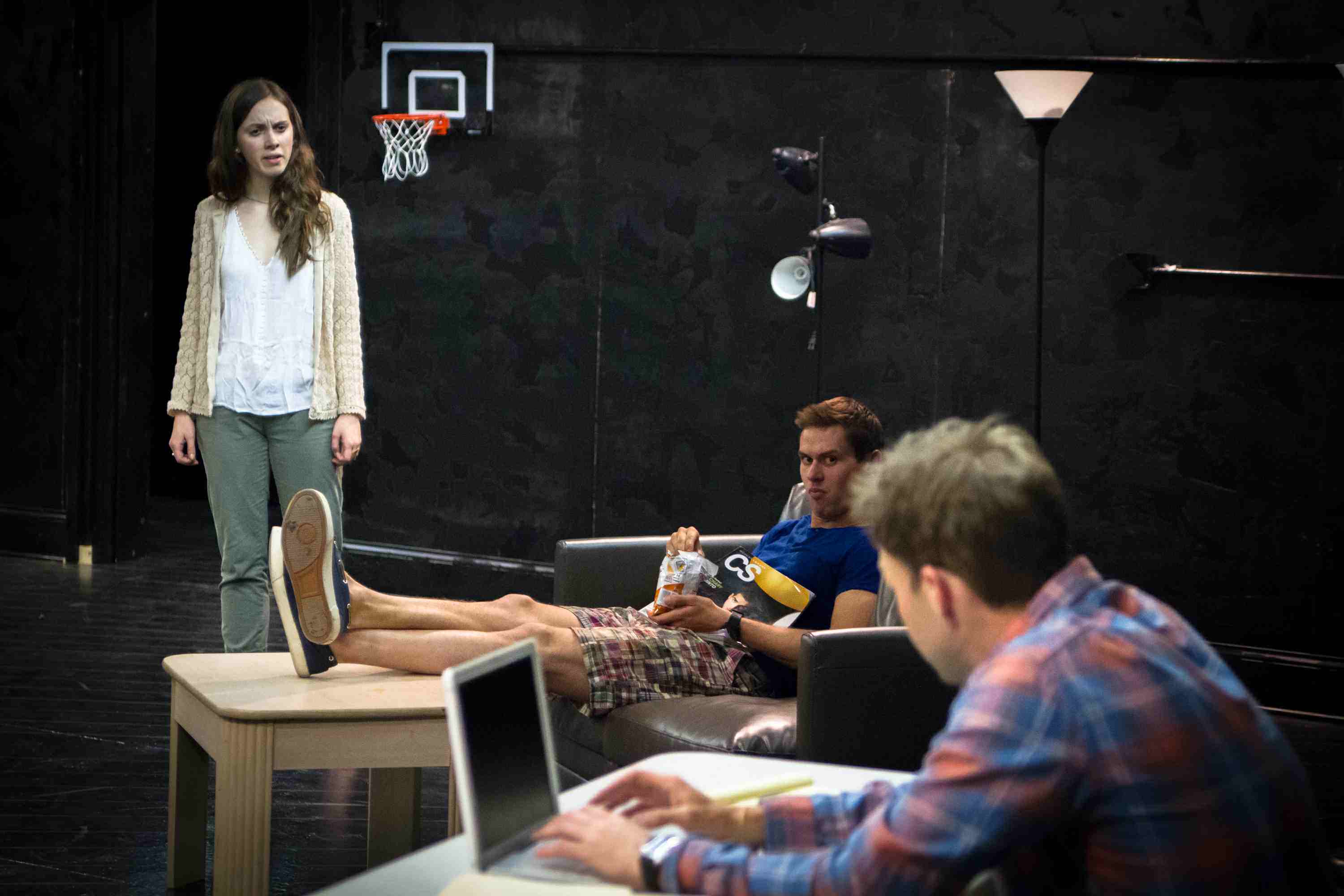 Director David Prete takes a subtle and hands-off approach to the moral dilemma at the center of the play, shifting focus to the FatPig_Rehearsal03broader social pressures weighing down on it’s characters. Kyle Hamman’s omnipresent video projections, for instance, which sprawl across several television monitors placed conspicuously upstage are replete with inflammatory remarks like ‘fat bitch,’ suggesting the persistent intolerance of our media-infused culture which reduces all of life’s complexities to two flattened dimensions.