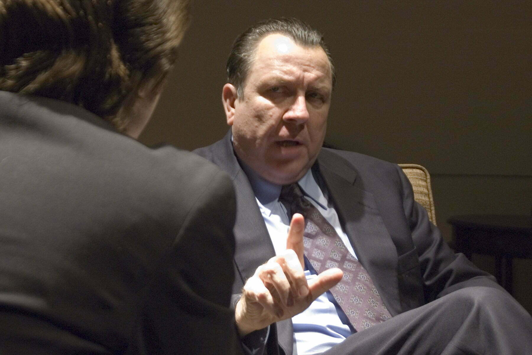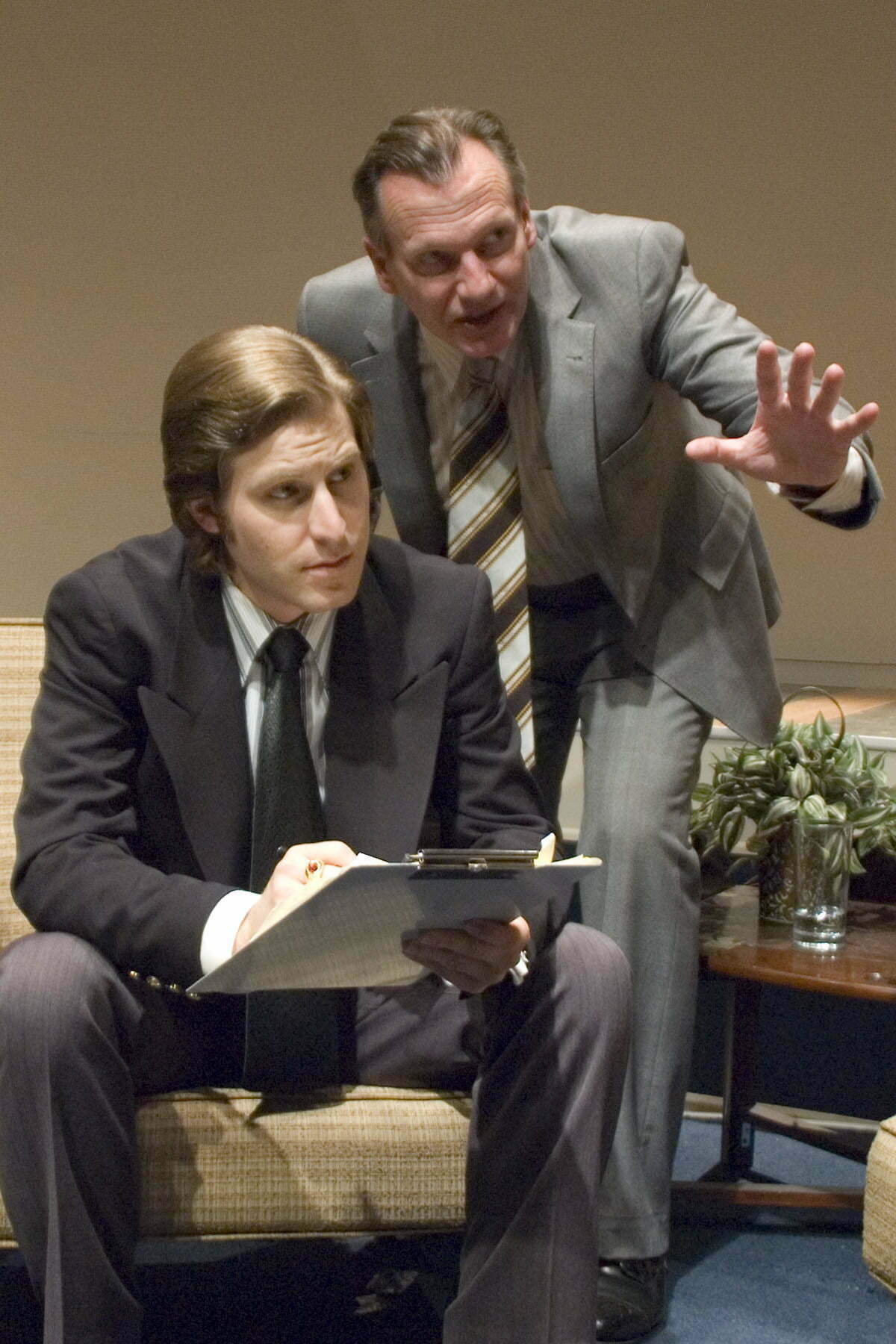 Frost is surrounded by three key advisers nicely played by Don Binder (Don Zelnick), Dennis Grimes (John Birt) and Matthew Brumlow(Jim Reston). They couched Frost on strategy and feed him questions to ask Nixon. Nixon relied on his vast interview experience and his chief of staff Jack Brennan (David Parkes).