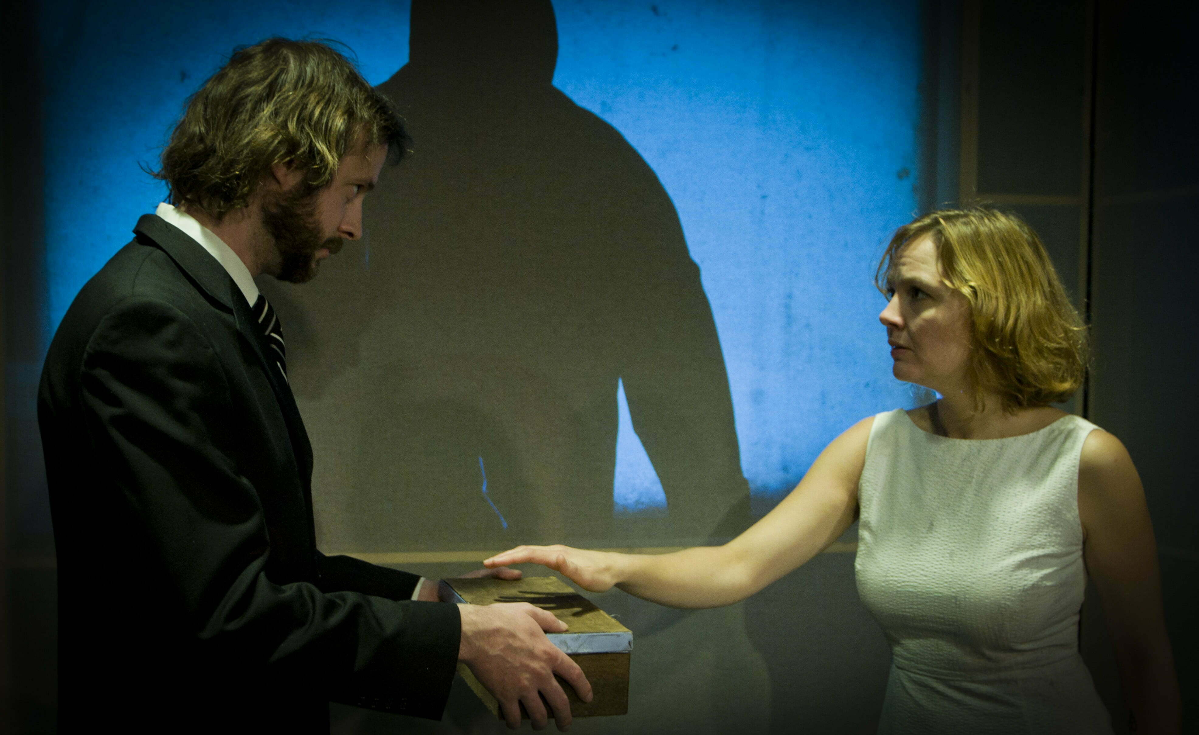 Director Mitch Golob has served Colburn’s ideas well by organizing a tight performance that blends the mixed media format with precision. Paradoxically chilling and beautiful at the same time, the art direction is a reflection of the complicated dialogue. The footage running in the back of the stage is shot extremely well and edited even better.  The added effect of a looming silhouette behind the movie screen (played by Michael Coale) accentuates the symbolism of the husband as a “shadow”, and once again, complements the script quite well. It almost feels like see a piece of installed art that runs on a continuous loop.