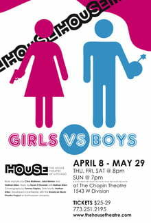 I love going to concerts, even though I don’t always have the time to get to them. There’s nothing like standing amongst a group of screaming fans cheering on your favorite artists. Singing your favorite songs at the top of your longs while giving in to the euphoria of a moving mass of people fully released of their inhibitions. Wicker Park is among the hottest areas for up and coming artists, rife with enough music venues to satisfy the musical needs of most anyone. House Theatre’s idea to turn their new loud (rock) musical at the Chopin Theatre, Girls vs. Boys, into a concert-like experience is a great idea that fits in perfectly with this part of Chicago. However, the material of the show does not create rock concert euphoria because it is not fun. The music is continually interrupted by long scenes of cheesy dialogue, the characters are stock and interchangeable, it is often difficult to hear the singer/actors onstage, and rather than stirring the audience into the frenzied euphoria I mentioned, it begs the audience to have fun.