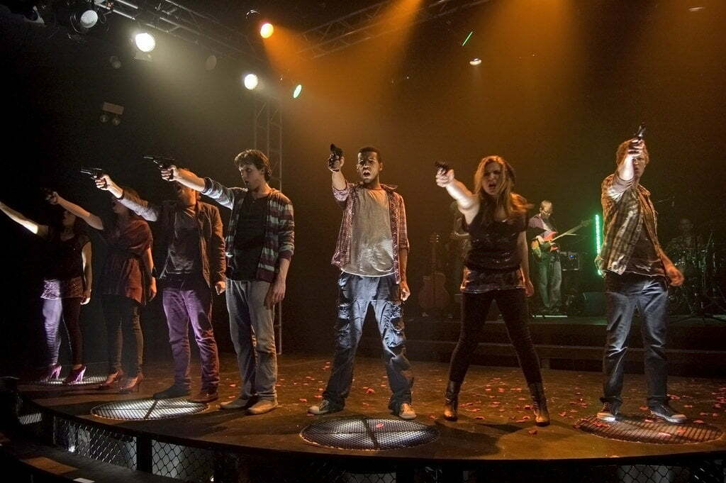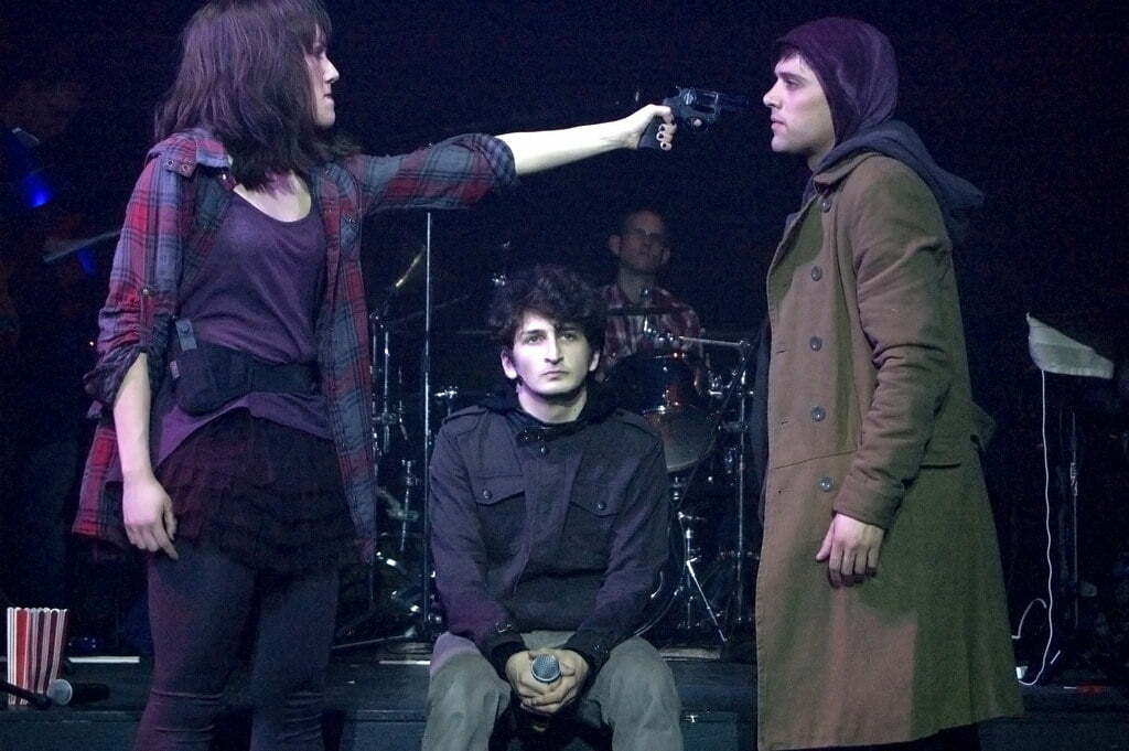 The concert atmosphere is created by having a pit area where audience members can stand and move around throughout the show (you are able to get seats as well). It reminded me a lot of venues such as the Riviera and Aragon. Collette Pollard’s set design is wonderful in creating this effect and setting the tone from the first moment the audience enters the theatre. Director Nathan Allen has formed a show that is geared towards my demographic (college students, recent graduates, and late 20s), but it doesn’t speak to that group. If some of the language was cleaned up, this could possibly be done for high school students. They would probably be able to relate to the material more strongly. The success of each performance is highly dependent on the pit because if it is empty or they are visibly not enjoying themselves, that feeling translates to the rest of the audience. I have been in a pit with music I wasn’t crazy about, but everyone was having such a good time that the mood became infectious. The staging is problematic because a majority of the talking scenes are done with two characters standing far apart speaking lines back and forth. Other scenes, the characters are sitting on the ground in a corner of the stage that I could not see from the left side of the audience. For all of the problems with the script, one decision I can not put my finger around was the excessive use of guns. Every character often holds a glitzy silver gun and points it at someone as a threat. I believe it is supposed to be symbolic of the danger and violence, but it is used so excessively that it becomes a distraction. There is also an excessive use of red flower petals when people are “shot” and glitter for when people use pills. Rather than being striking visual moments, these symbols are overused and lose their impact by the fourth for fifth time they seen.