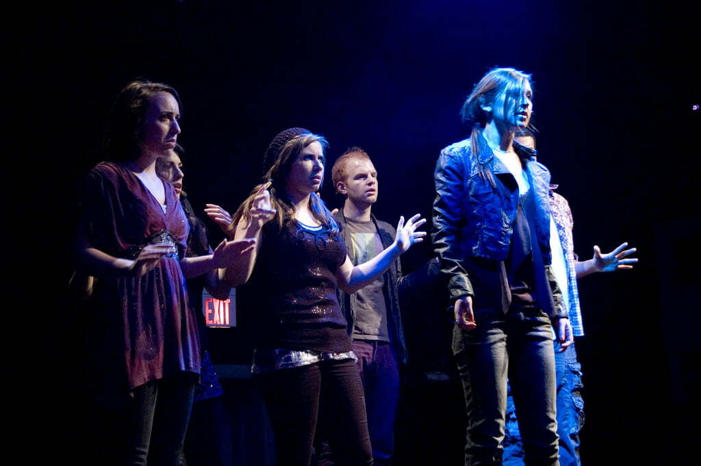 It seems like the project is meant to be gritty and rebellious, but it comes across like a PSA to high school students. The basic story revolves around six teenagers searching for happiness in a world of sex, drugs, and parties. Casey (Tyler Ravelson) is on pills for his aggression, his sister Sam (Dillan Arrick) is a freshman wanting to be treated as an adult and finds company in party boy George (Kevin Stangler); Lane (Nicky Scheunke) has just had an abortion and struggles over the dissolution of her relationship with Kreuger (Joel Gross) who is rebounding with Lane’s friend Kate (Whitney White). The story feels like a teen soap opera on the WB with music. I can not fault the actors for effort, as they keep high energy throughout the show and do their best to deliver the dialogue in a sincere manner. Whitney White belts her songs with verve and sass, and Nicky Scheunke’s presence on her first number was the closest the show comes to feeling like a rock concert.