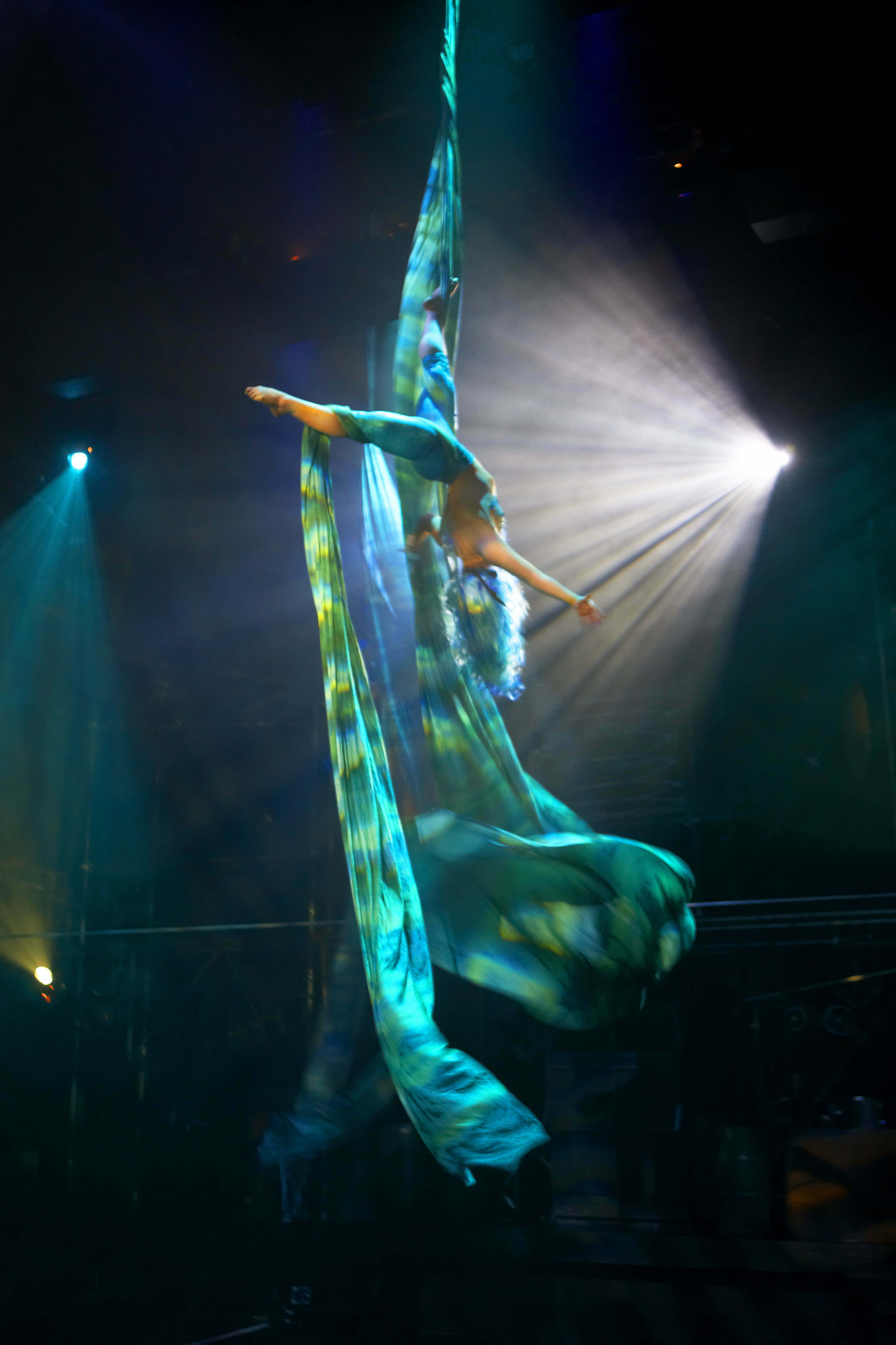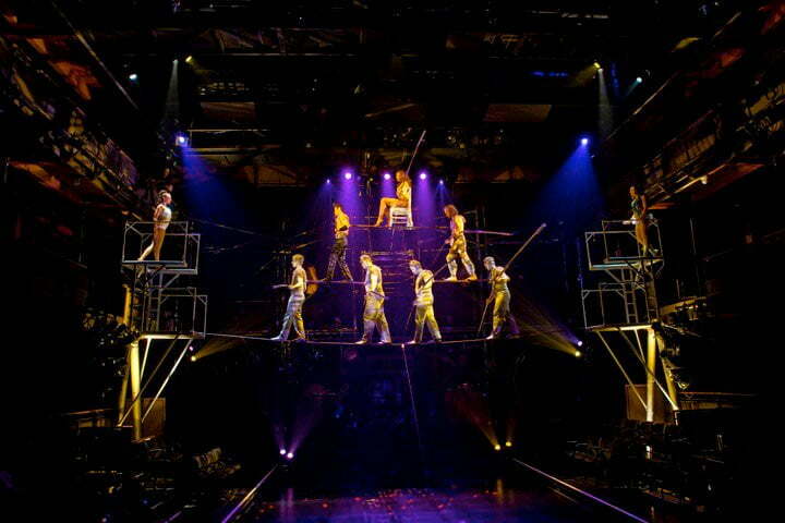 The story begins with a young girl struggling with her family life that finds solace in the story of Hephaestus.  For those unfamiliar with the myth, Hephaestus was the son of Hera, but was born disfigured.  In her disgust, Hera threw Hephaestus down from Mount Olympus.  He fell so far that by the time he hit the ground he was a grown man.  He is crippled by the fall, but discovers he has an unparalleled ability to forge things out of metal.  He creates an army of “Silvermen” who assist him in his craft, and is eventually approached by Hera to return to Mount Olympus as “God of the Forge.”  Although there is some narration, the majority of the story is told through circus stunts and visual spectacle.  Each spectacle is more fantastic than the last; starting with sea nymphs suspended from the ceiling doing acrobatic moves on pieces of cloth as bubbles fill the theatre and stick to the ground.  The simple touch of having the bubbles remain is highly effective.  The “Silvermen” create an eerie image just from their presence and engage in Stomp-like numbers with a hint of Blue Man Group thrown in.  The gods and goddesses have high-flying, back-bending moments that will have your jaw literally hanging open.  As I have previously said, the finale will blow your mind away.  It is a 7-person high-wire pyramid that is rarely done even at a regular circus.  The only time I have seen anything like this done, is on the now cancelled “Guiness World Records” show.  I could not believe my eyes.