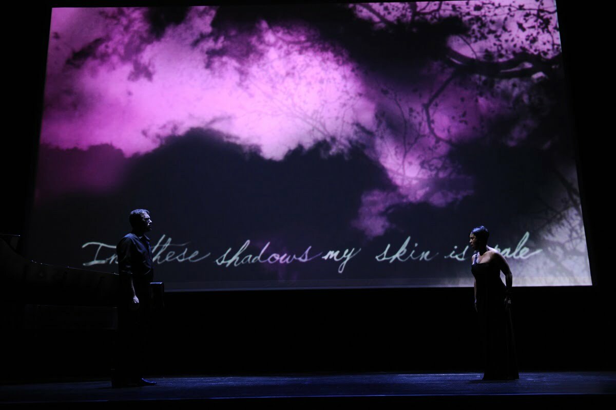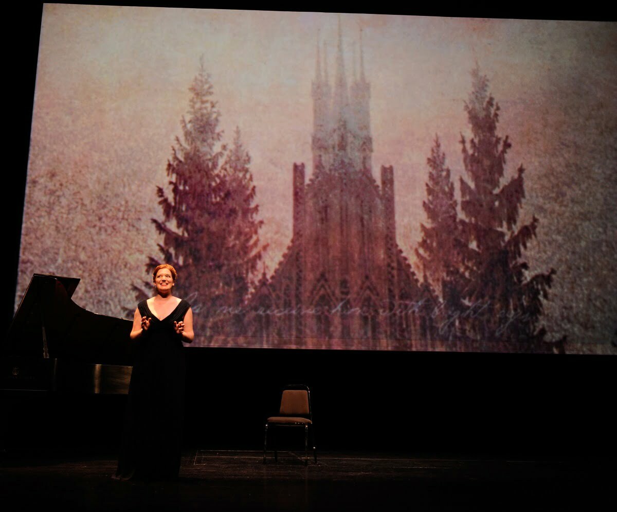 The first piece performed is Schumann’s Frauenliebe und Leben, a song cycle based on the poems of Adelbert von Camisso. Craig Terry on the piano and the Mezzo-soprano Jennifer Johnson Cano create sorrowful, sentimental, and joyous music, with the lyrics and images projected sparingly, helping to set the mood. It is music to fall in love to – and it embraces all the happiness and deep, lasting pain that love brings. The passion with which Ms. Cano sang, and the deft care with which Mr. Terry played, convey all the emotions to their head; lyrics like “help me, sister, with my wedding dress” brought the audience to their knees.