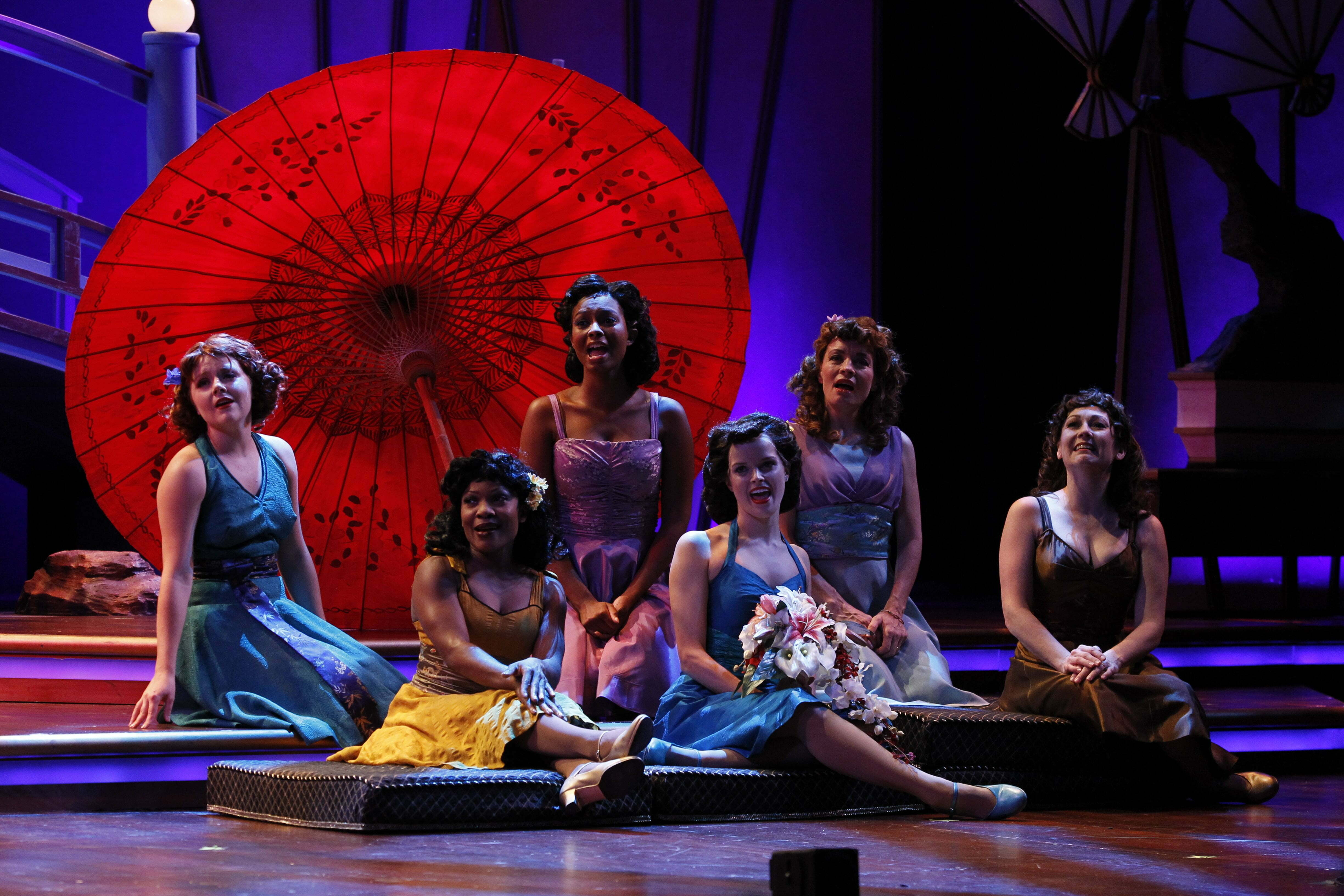 Entering Drury Lane Theatre, you see a strikingly elegant Japanese woodcut pagoda with a footbridge flanked by two gigantic folding fans (set design by Marcus Stephens) and when the show opens we are greeted by the six Gentleman of Japan (Evan Autio, Matthew deGuzman, Jarret Ditch, Stephane Duret, Tommy Rapley and Sean Walton) who are the dancers with the Ensemble of Karen Burthwright, Amanda Krroiss, Tammy Mader and Katie Spelman upon which fuel much of the action revolves. Not a finer dance troupe could have been found. These folks swing, tap and move with joy and precision.