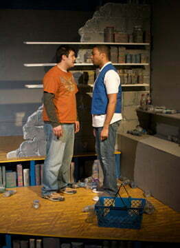 Meanwhile, the meth-addicted Dirk must drive with Tommy and Eben to the convention. Why is this character in the play? A mystery. Dirk smokes meth while he ignores Tommy and he slowly flirts with Eben. He sense that Eben has something powerful in his luggage and he wants to be apart of Eben’s plan. He also kisses and sexually advances on Eben- who easily succumbs. The gay theme conflicts with the plot. We never completely see the connection between Eben’s pain and his wanting to do harm to corporate Valumart? Eben’s gayness only confuses things. Dirk is a undeveloped weirdo and Tommy simply want to be with his love – Eben.