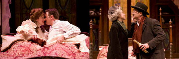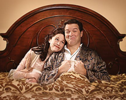 Local Chicago favorites, Bernie Yvon and Heidi Kettenring deftly present this sweet, charming and honest musical look at the cycles of marriage. Filled with clever lyrics by Tom Jones upon Harvey Schmidt’s varied music, I do! I do! is fine entertainment. I Do! is a tough show because both actors must have strong voices together with enough acting skills to be believable. Yvon and Kettenring have that plus terrific stage chemistry. We quickly love both and we enjoy their 50 year journey. Agnes is a pure Victorian wife who does the housework and raises their two children. Michael is the male chauvinist novelist with a large ego and a commanding nature. Love is their bond. A large fourposter bed is the apt symbol for marriage.