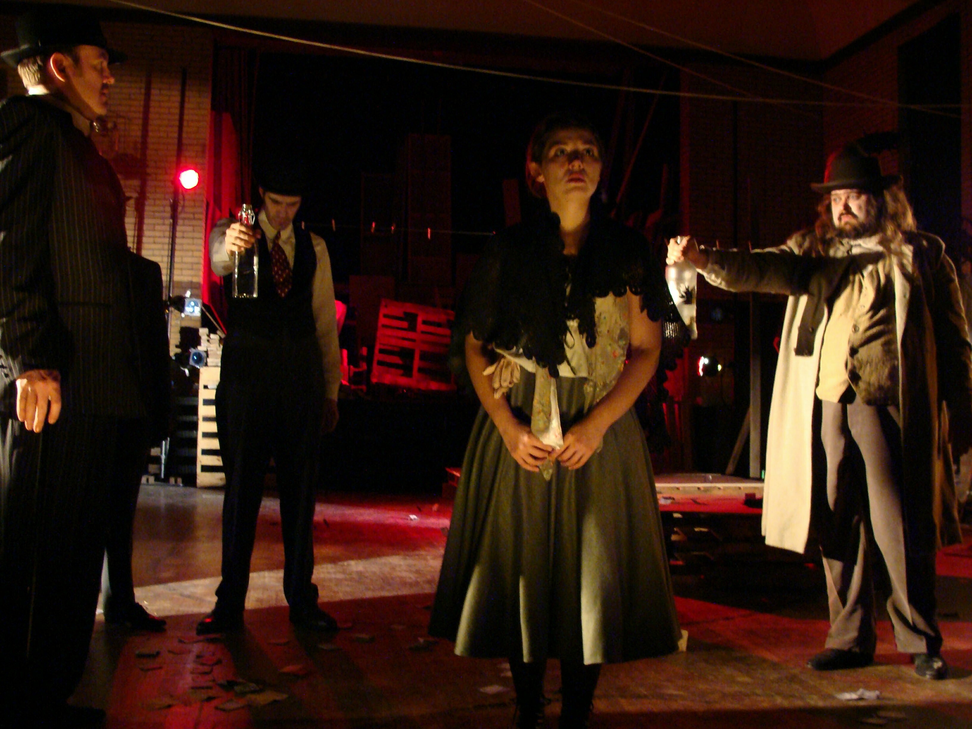 Rory Jobst, as The Barker set the dark tone as he announces each round in the match or duel. Tiffany Bedwell plays maria Garga, George’s sister who works for and falls in love with Schlink while Stevie Chaddock plays Jane Larry, George’s girlfriend who become a whore. Suzanne Miller plays George’s mother and Ben Veatch is George’s father. Is George willing to give up his family in order to defeat Schlink?