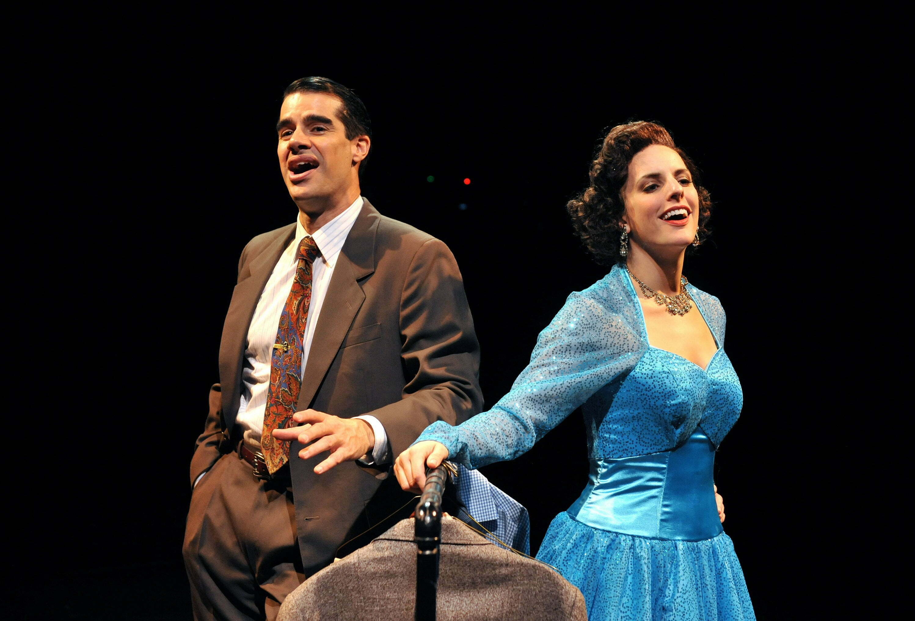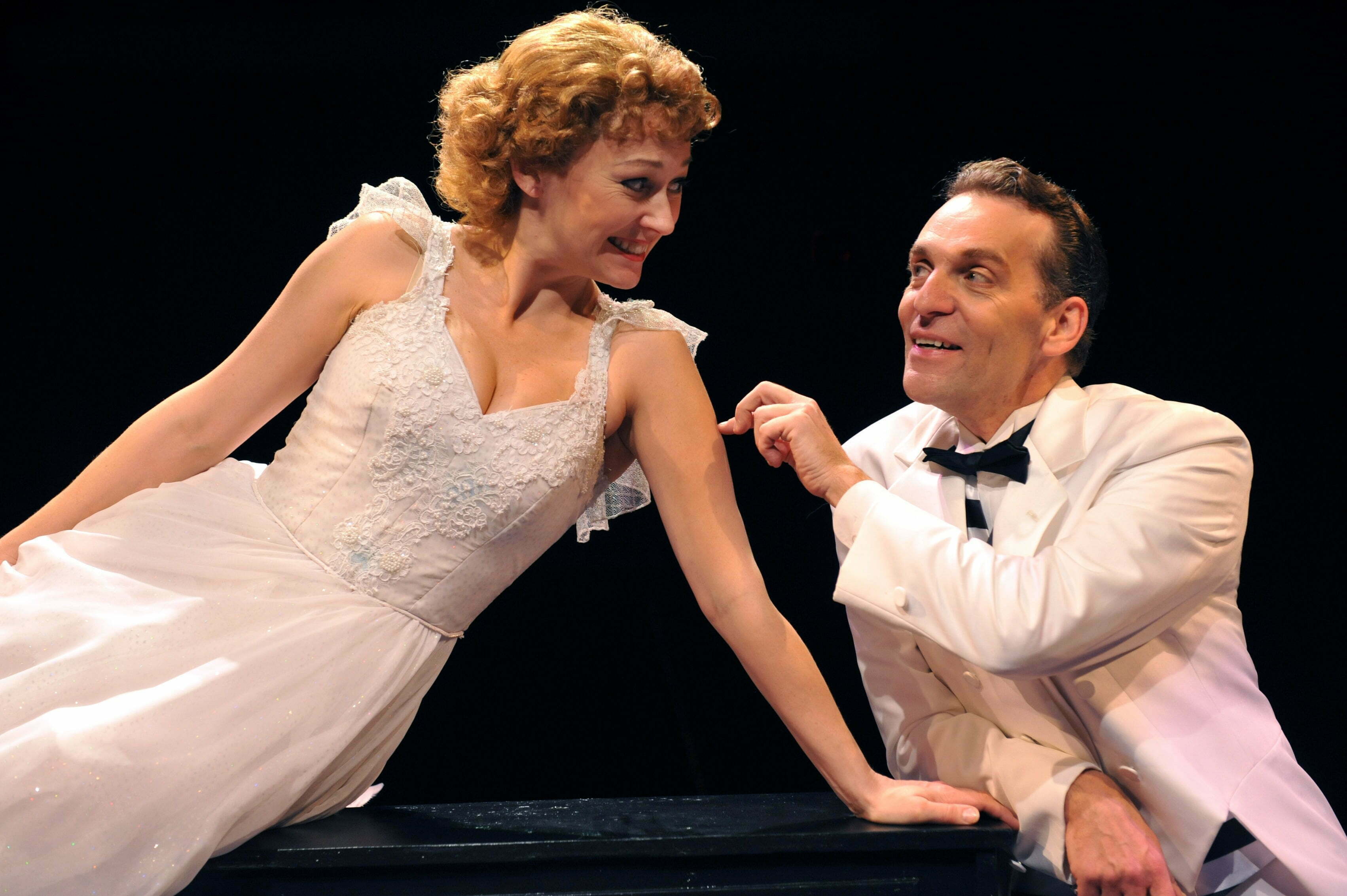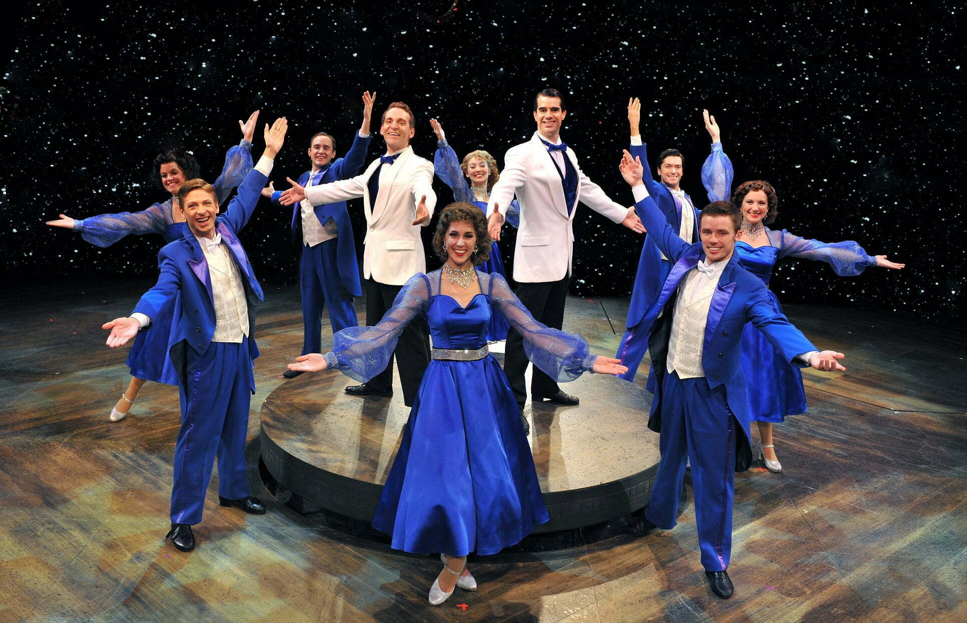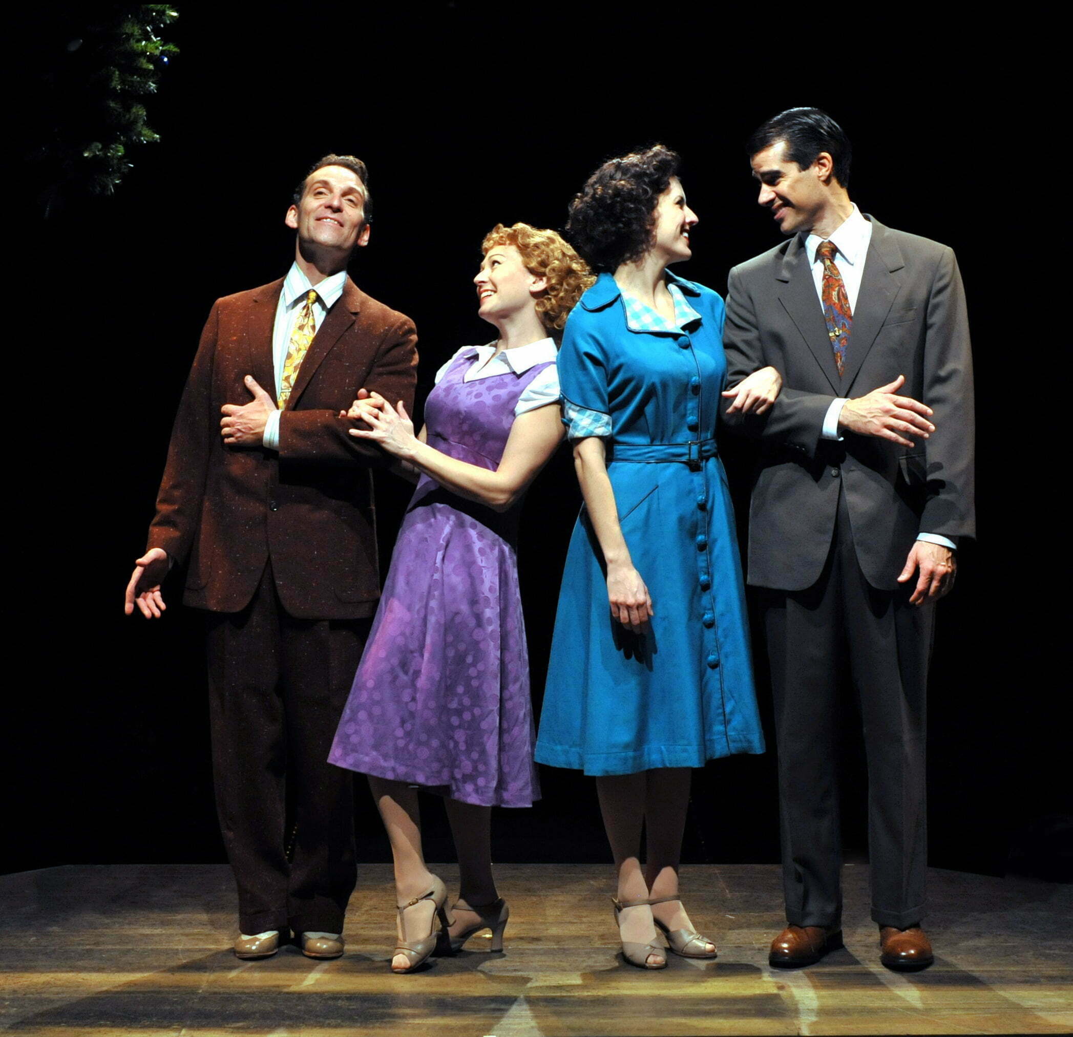 The storyline follows two song and dance men (Bing Crosby and Danny Kaye in the film) here Bob (Rob Thomas) and Phil (Andrew Lupp) from their days in World War II to the early 50′s as they appear on the Ed Sullivan Show doing “Let Yourself G0.” This backstage musical finds Phil, ever the skirt-chaser trying to set up his partner Bob with a soul mate. They sing “Love and the Weather.” Phil takes Bob to see a sister night club act featuring Betty (Stephanie Binetti and Judy (Tammy Mader)–the sing and dance to, what else(?) “Sisters.” Phil and Judy instantly connect while Bob and Betty quickly become adversaries but subtle sparks do fly.
