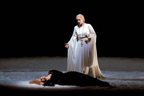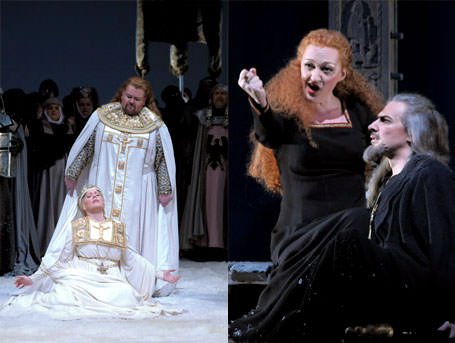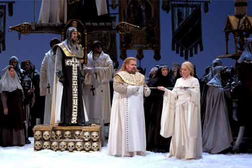 The opera is set in the German 10th century, in which King Heinrich of the Holy Roman Empire (impeccably performed by the German bass Georg Zeppenfeld) is gathering troops to crush the oncoming Hungarian onslaught. He has been traveling throughout the empire, but, as the action of the opera begins, he arrives at the dukedom of Brabant. Here, political turmoil simmers: Friedrich, Count of Telramund (Greer Grimsley, bass-baritone, in a well-executed role) accuses Elsa of Brabant, the late Duke’s daughter, of killing her brother and taking a secret lover, in order to seat herself on the duchy’s throne. This he has been told by a “witness,” his wife Ortrud (savagely done by Michaela Schuster, a Bavarian mezzo-soprano whom Friedrich II would have praised), the woman he opted to marry instead of his betrothed Elsa, because of this scandal. Since Friedrich is the Duke’s brother, he becomes the heir apparent and claims the throne. He is Wagner’s personification of Honor: he does what he does out of honor, for the sake of honor, in pursuit of honor. But Woman has led him astray. Woman is, for Wagner, the causa prima: all action in the play can be traced back to Elsa or Ortrud; and the play, it should be noted, is tragic. These women, like Eve, are the reason Men fail. Elsa symbolizes purity, but because she is a woman, she cannot be perfect: she falters, and brings down not only herself, but Lohengrin as well, who must depart because of her doubts. . . . Which brings us to what Lohengrin is, at its heart: namely, Wagner’s crusade against doubt. Because Elsa wishes to know her lover’s—her husband’s—name, she is killed; she has doubts, she has trouble believing—being sure without any proof whatsoever (in short: faith)—that her savior knight is indeed holy. He may come, as Ortrud contends, from unholy sorcery. Once more, Nietzsche (one of the best students of Wagner who ever lived): “Lohengrin contains a solemn excommunication of inquiry and questioning. Wagner thus represents the Christian concept, ‘you ought to and must believe.’ It is a crime against what is highest and holiest to be scientific.”
