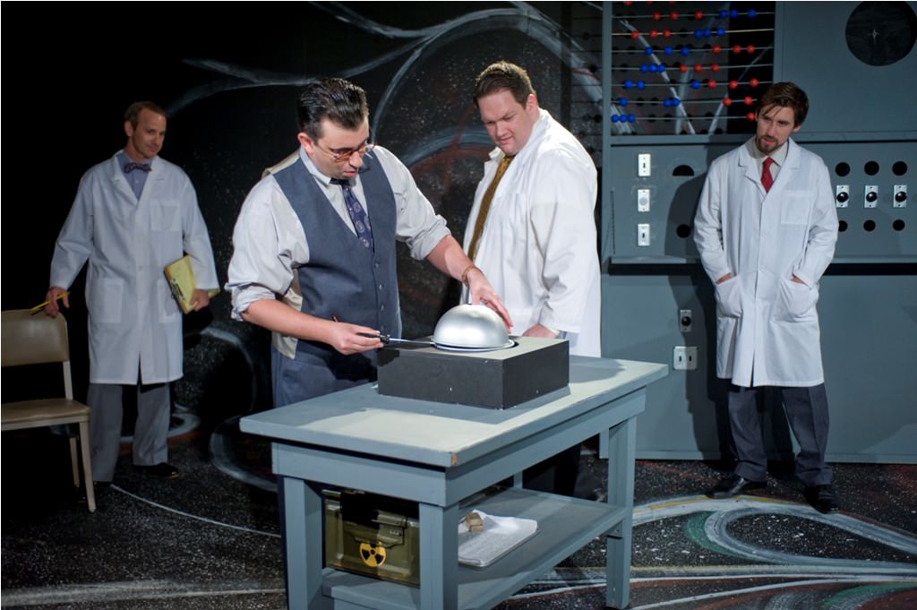Paul Mullin’s Louis Slotin Sonata is an ambitious work filled with lessons in quantum physics, World War II history as well as Jewish traditions and scientific methods. This unique work does try to cover too much and is about 20 minutes too long-yet it quickly engages us with am inside look at one of the genius scientists who, as part of the Manhattan Project, developed the atomic bomb. In Louis Slotin’s story we are able to understand the foibles that can render a genius scientist into a reckless show-off whose cavalier behavior led to his own demise. The play recognizes a human dilemma – will our voracious curiosity together with our cockiness get us to destroy us or will it lead to enlightenment?