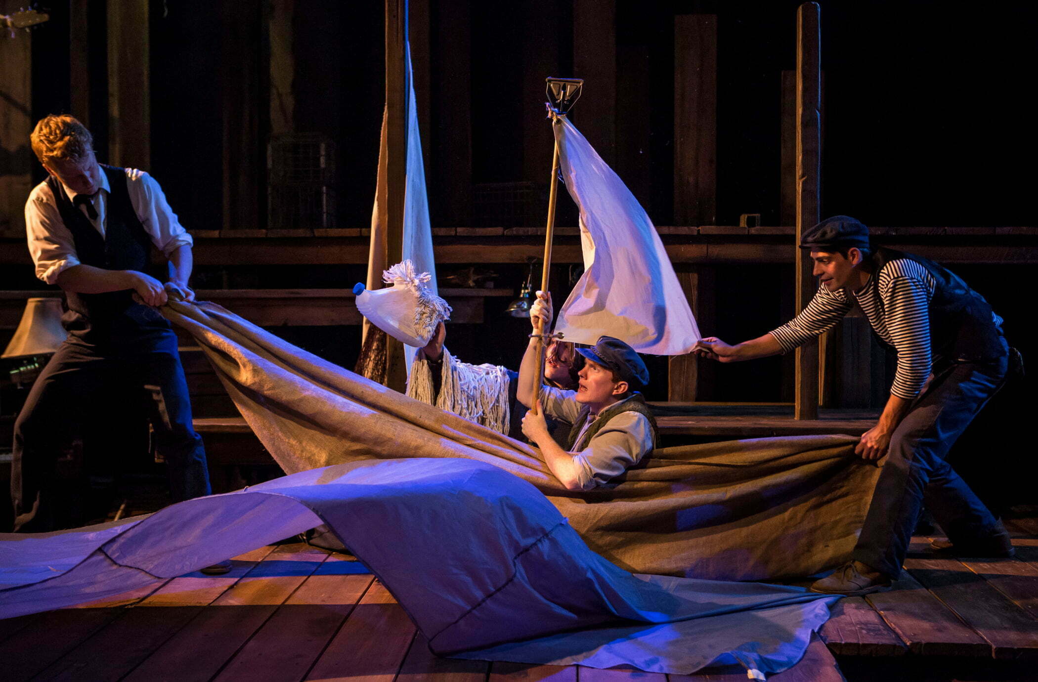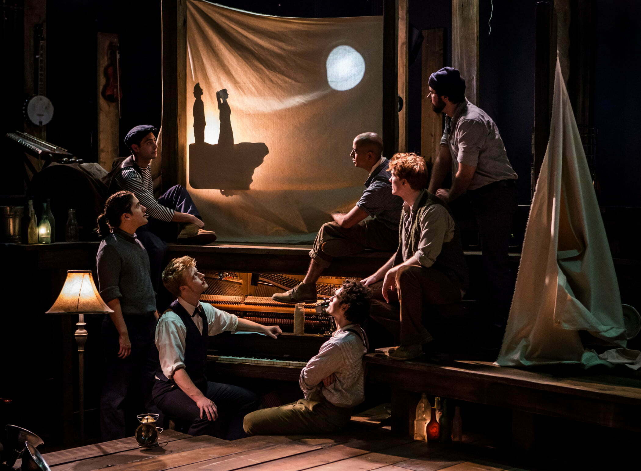 All the elements work together to stimulate the senses; live music underscores the action, innovative use of shadow puppets to tell the story as well as empathetic acting by the seven man ensemble. Visually and audibly stunning, The Old Man and the Old Moon  is an adventure well worth taking. The intimate staging at Writers Theatre’s thrust stage gets the audience as a will participant in the journey.  The narrative is complete and the journey is exciting and surprisingly  unique yet it somehow seems familiar. But here, imagination rules as the charming Pigpen boys stimulate us into their narrative and we enjoy every moment of the 100 minute saga. This show exudes the passion and manic energy of Pigpen boys. That translates into a fun theatrical experience. The Old Man and the Old Moon is one of the finest shows to arrive in the Chicagoloand area in many a year! Take youngsters to Glencoe to see what unleashing creativity in storytelling is all about. They’ll be impressed.