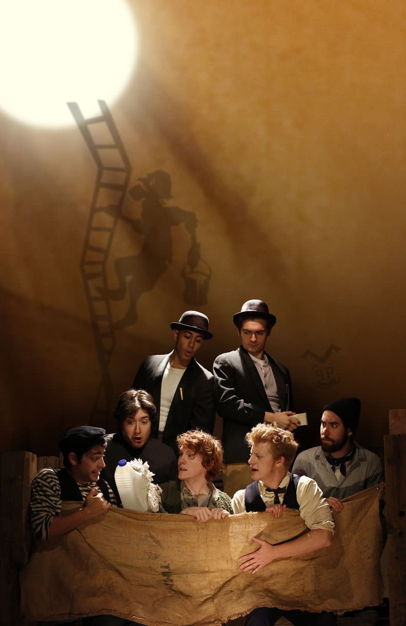 College professors need to be aware of what they say to their students as when Stuart Carden challenged seven freshman students at Carnegie Mellon University in Pittsburgh to unleash their creative bounds. Alex Falberg, Ben Ferguson, Curtis Gillen, Ryan Melia, Matt Nuernberger, Arya Shahi, and Dan Weschler instantly began creating  dramatic shows with no limits. They blend resonant storytelling with spirited original indie-folk music (all play at least one instrument) with inventive use of shadow puppetry as well as using ordinary objects as puppets. These guy almost redefine ensemble creativity as all seven are equally involved in the writing and staging of all their works.  While still in college, these seven formed Pigpen Theatre Co. that did a variety of creative endeavors including live shows, music concerts and recordings, film projects, even a children’s book. All their projects are devised collectively as no individual receives writing, composing or directing credits. They start with what story they want to tell, then they figure out how to best tell that story. the results can be magical.