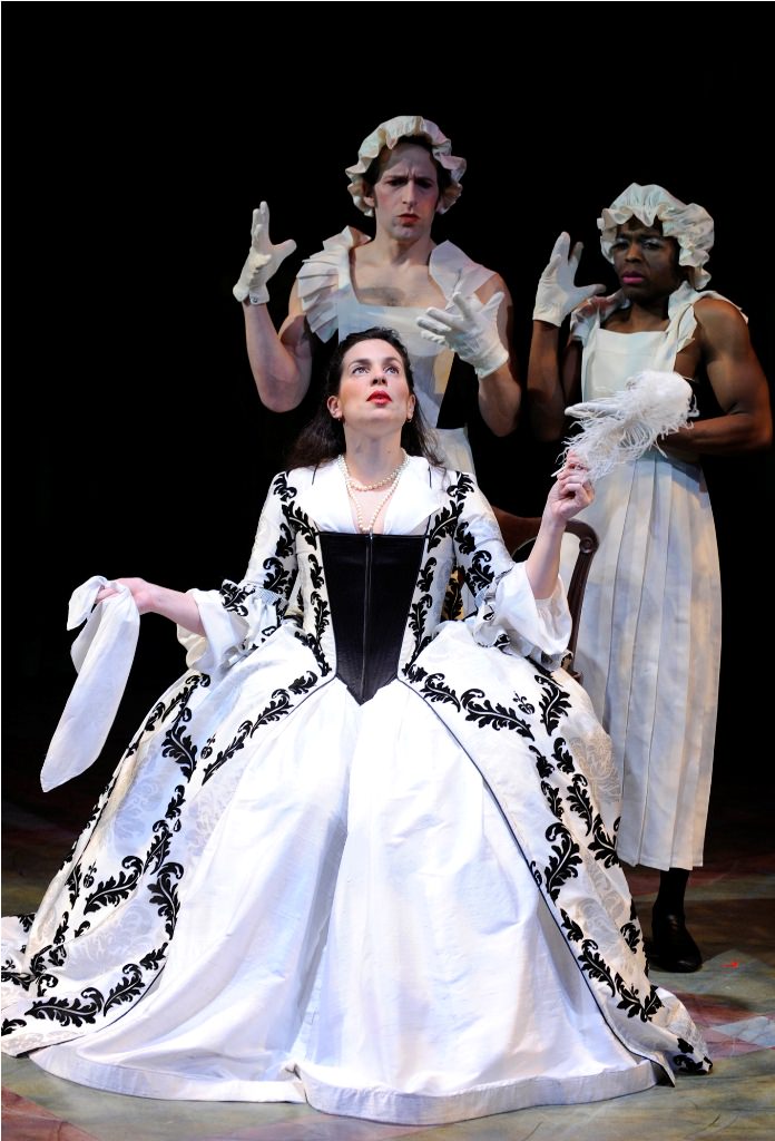 It is, indeed, a fanciful romance, and the staging matches the story. Beyond the two actors mentioned above, the players consist only of a four-man chorus (Thomas J. Cox, Adrian Danzig, Kevin Douglas and Lawrence Grimm) who play various parts throughout the ages. There are only minimal sets: two side-tables on wheels, as faux-dressing rooms, two beds, some chandeliers and bare light bulbs. And so the chorus, using similarly minimalistic costumes and makeup, and the lighting help set the stage; each actor not only plays their roles, but also acts as narrator.
