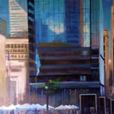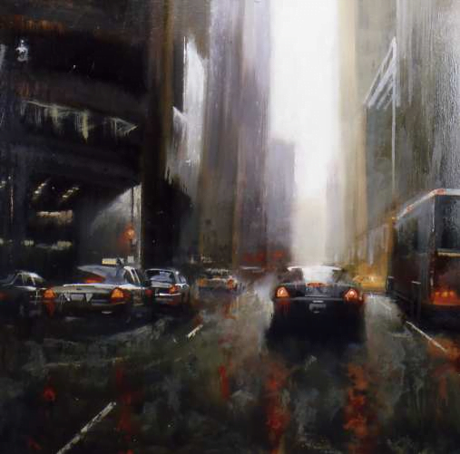 curly tale fine artsBeing a west coast artist who recently moved to Chicago and still new to the Chicago art scene, I am impressed with Robert Brasher’s paintings. Towering buildings, brilliant reflections, bustling crowds, and the glow of city lights stand out through the Chicago weather, creating not only a very convincing look, but also a strong feel of everyday Chicago life. Brasher’s very free, yet descriptive brushstrokes, beautifully create a strong series of fantastic paintings containing atmospheric cityscapes with gestural figures that feel at home in his paintings.