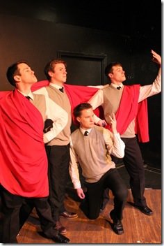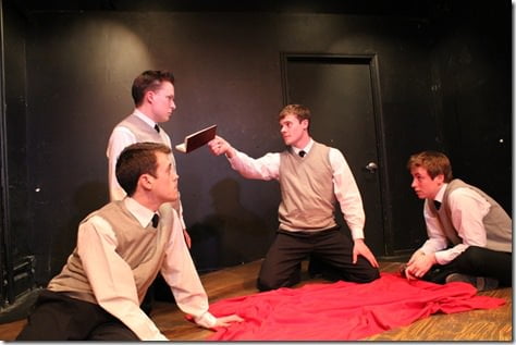 Adapter Joe Calarco dares to have a group of prep school boys, so filled with emotional and sexual tensions, that they use acting out Romeo & Juliet in a sheltered space on campus as a release of their bottled-up tensions. When Student 4 (Matt Dyson) whips out the text of R &J, all faces light up in mock appreciation. Each of the four students tackless several roles to produce an edited two hour version of the classic romantic tragedy.