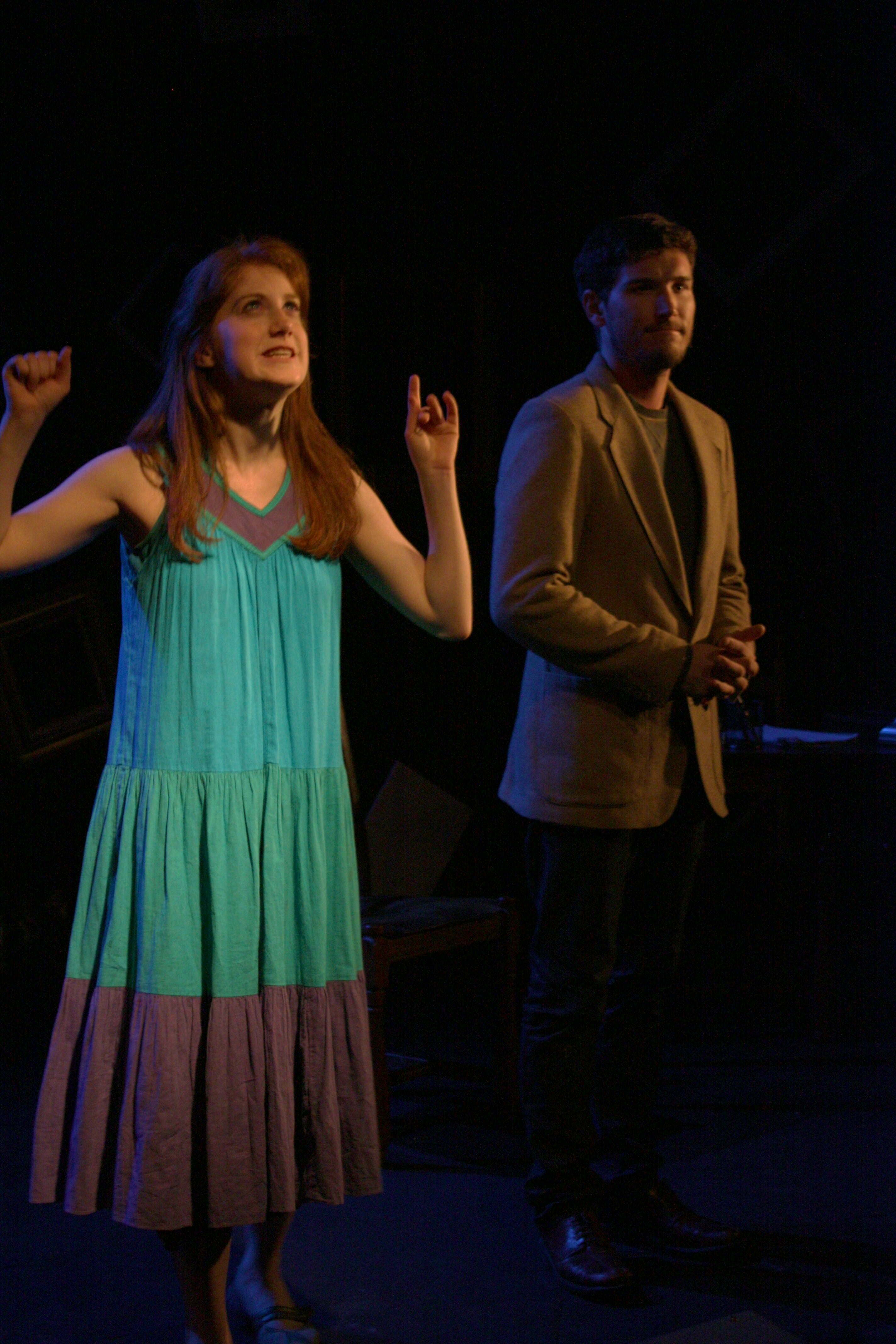 With all the praying, I thought I was at a Catholic retreat being held at Trap Door Theatre with Sister Calling My Name. This is a memory play that finds Michael (Luke Daigle) telling his memories of his reconciliation with his mentally retarded/schizophrenic younger sister. We meet Lindesy (excellent work by Katie Cheely) Michael’s mentally challenged sister. We see that she is incapable of rational thought and she seems to be highly influenced by who ever is her guardian.