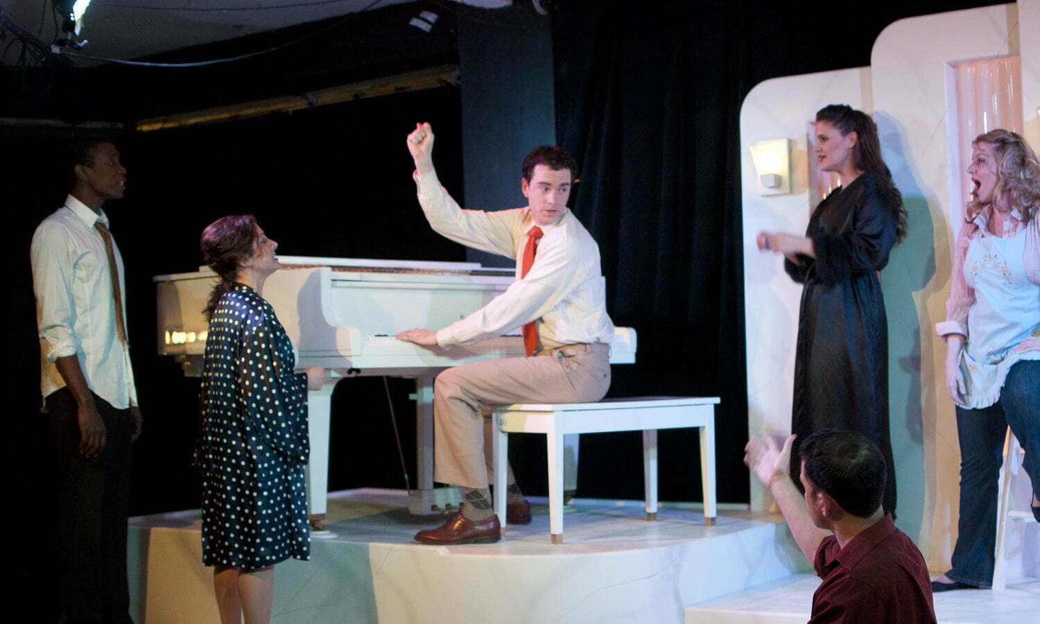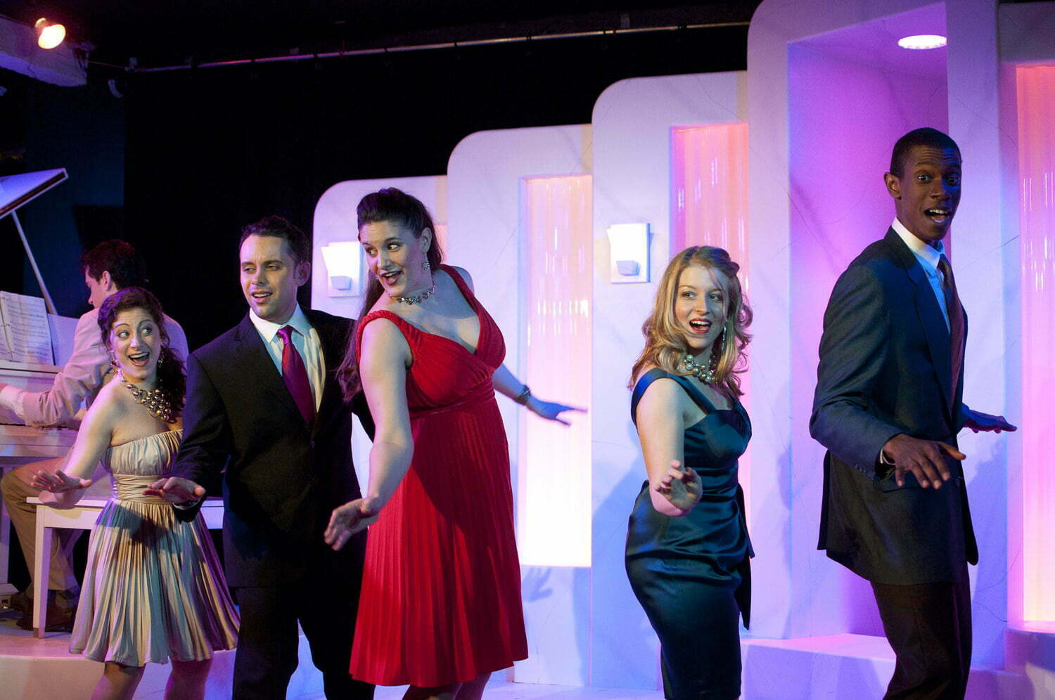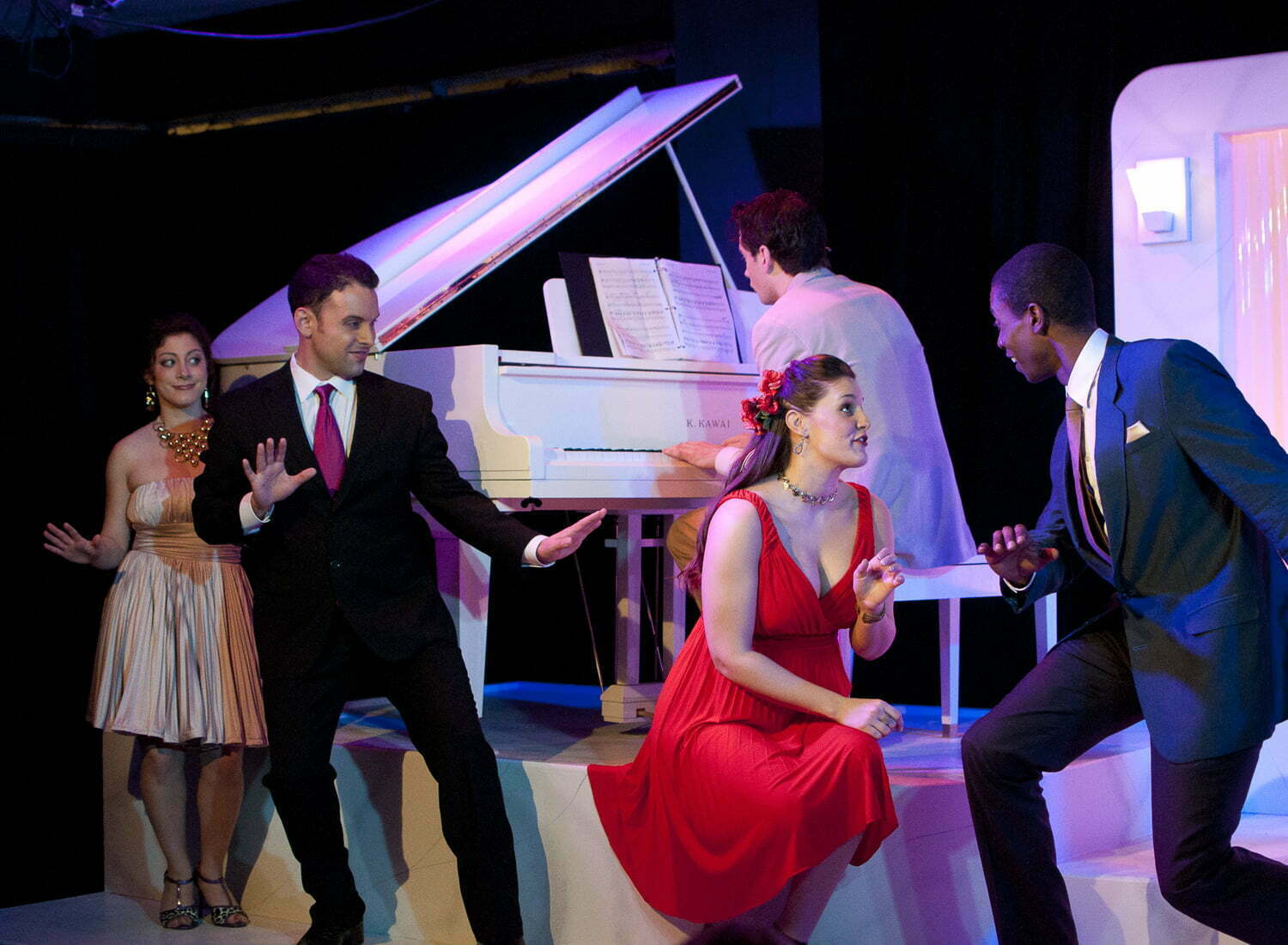 Under Fred Anzevino’s smart direction and Austin Cook’s innovative music direction, the Rodgers & Hammerstein songbook never sounded so lush and heartfelt. Yes, Some Enchanted Evening contains a wonderful 36 + R & H show tunes that play as a master lesson in song writing. The cast of six: Dana Tretta, Jeremy Trager, Sara Schoch, Danni Smith, Evan Tyrone Martin and pianist/ music director Austin Cook each had their moments warbling the iconic R & H tunes. Much of the credit for mounting such a well sung revue goes to the sharp casting by Fred Anzevino who always seems to find new talent to populate his shows. But it is the stellar music direction and deft musicianship by Chicago newbie Austin Cook that made a difference. Cook’s fresh arrangements sparked the cast to fully enhance the rich songbook. Austin Cook also sang and music accompanied (on the piano) the singers. This guy’s a major arranger and talented pianist.