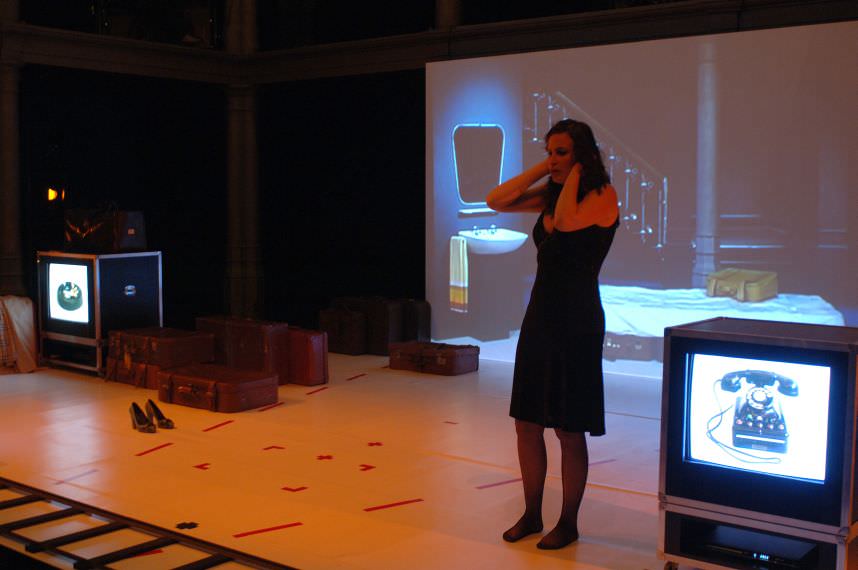 And the production does a great job with the text; the acting, the direction, the sets and costumes and lights. Noemi Schlosser finds all the deep crevices and crannies in this woman’s broken psyche and inhabits them. The set is bare, almost nothing but stage markings; there are two equipment racks with television screens in them, one showing a phone, the other showing images of a clock, dolls with legs swinging, an ash tray. They are at once symbolic and literal. The great projection screen in back shows us the hotel room with Emil (Vitalski, who is at once subtle and devastating), the woman’s husband, reading his paper.