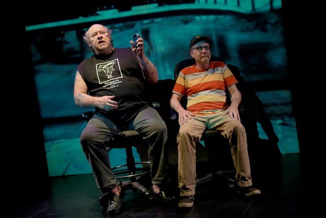 With Stations Lost, as the second part of Fitzpatrick’s trilogy (follows last year’s This Train), Fitzpatrick has written a most compelling and thoroughly engaging performance art piece. Adapted and Directed by Ann Filmer, Stations Lost uses the blend of personal storytelling, video art of Fitzpatrick’s unusual covers and illustration art and bluesy/folk songs (sung by Lynne Jordan to John Rice’s guitar) to express Tony’s impressions about his world.