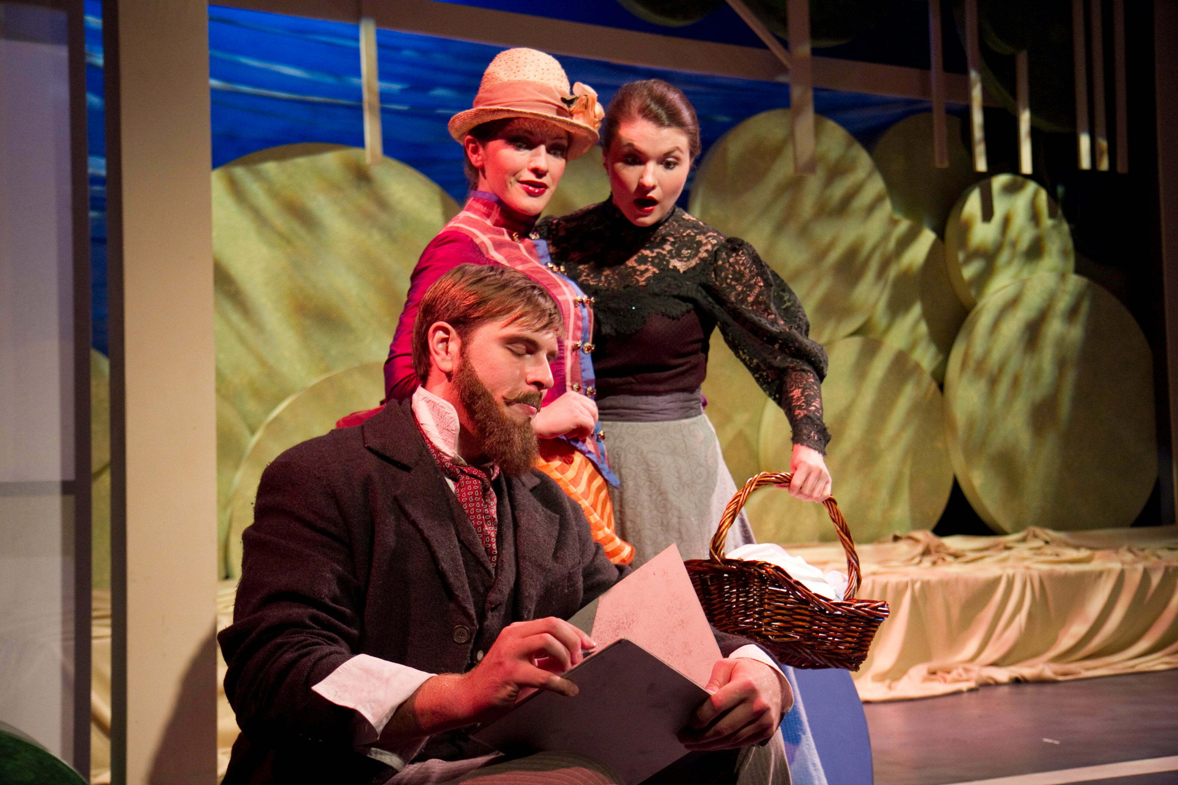 The musical follows Seurat as he journeys towards completion of his “A Sunday Afternoon on the Island of La Grande Jatte” landscape. His lover and main model is Dot, played and sung expertly by Jess Godwin. Dot is Georges’ lover deprived due to his obsession of his work. Sondheim wrote songs for the people that populate the Parisian Island in 1886 from Dot’s lament to the rigors of still modeling to the gossip surrounding the painter who appeared every Sunday to paint. Sondheim gives Georges and Dot a telling duet, “Color and Light” that speaks to Dot’s loneliness and Seurat’s attention to detail.  Act one ends with the entire cast  in still pose just as the famous painting seems to come to life.  The large circles in the background of Amanda Sweger’s set became a distraction but the final canvas presenting Seurat’s masterpiece was effective.