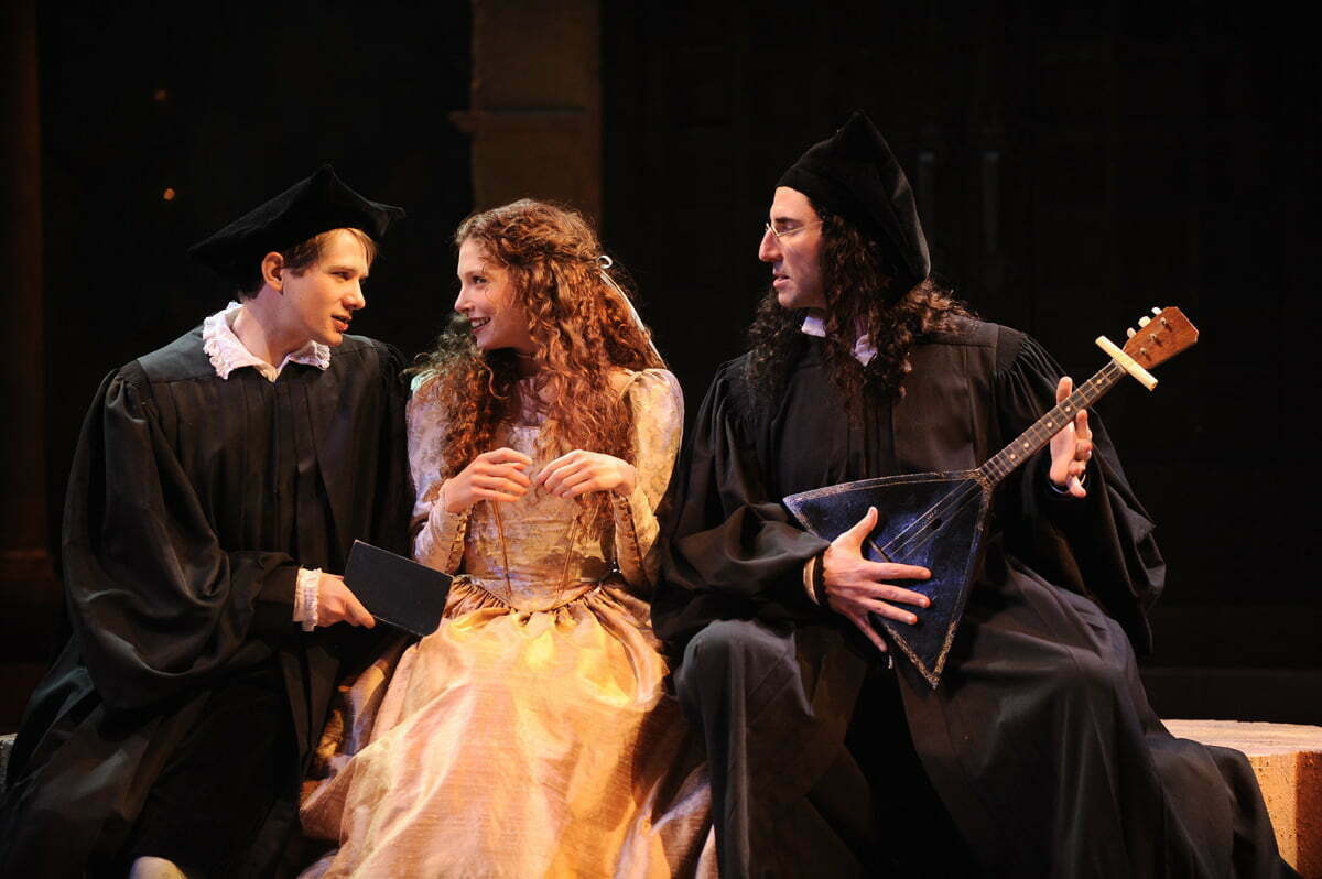 - Sean Fortunato as the other suitor, Hortensio, chewing on the earpiece of his spectacles while pretending to teach Bianca how to play the lute.