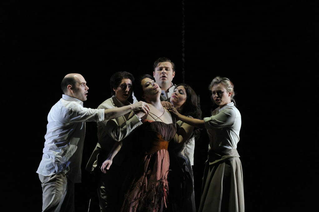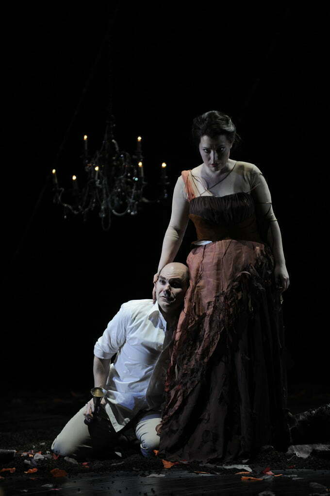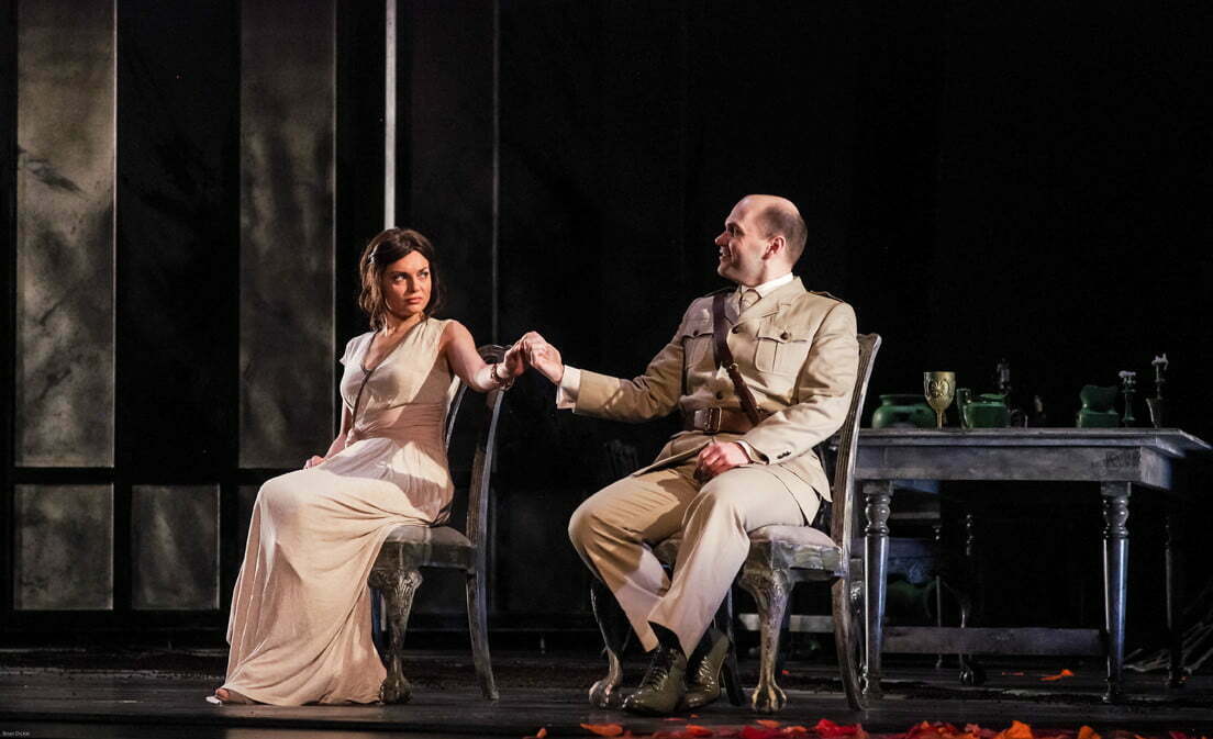 Set design by François-Pierre Couture brings the ancient tale into Mussolini-era Italy roughly 1930. It’s a strangely austere environ, augmented by Julian Pike’s lighting design which creates a stark tenebrism of sharply lit foreground and murky background. The costumes by James Darrah range from updates on Roman dresses to Fascist uniforms. It doesn’t quite mesh, but it’s hardly a quibble against such wonderful performances.