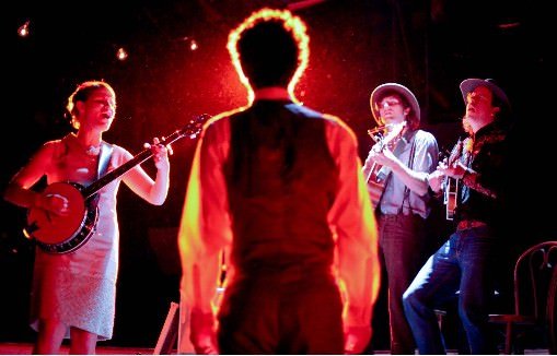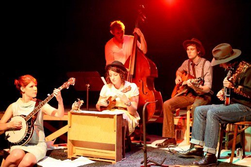 The talented folks at The New Colony, under the leadership of Andrew Hobgood, have amassed an impressive body of work over the last few years. Their latest, That Sordid Little Story, is a play-with-music that features a five piece jug band (Chris Gingrich, Thea Lux, Henry Riggs, Brandon Ruiter and Tara Sissom) playing an original score of country/bluegrass/folk tunes filled with rich harmonies, telling lyrics and the acoustical sounds of banjo, guitars, mandolin and bass. The band, know as ‘That Sordid Little Story,’ not only underscores the mood and covers scene changes, it becomes a character in the play. The terrific score alone is enough reason to see this show!