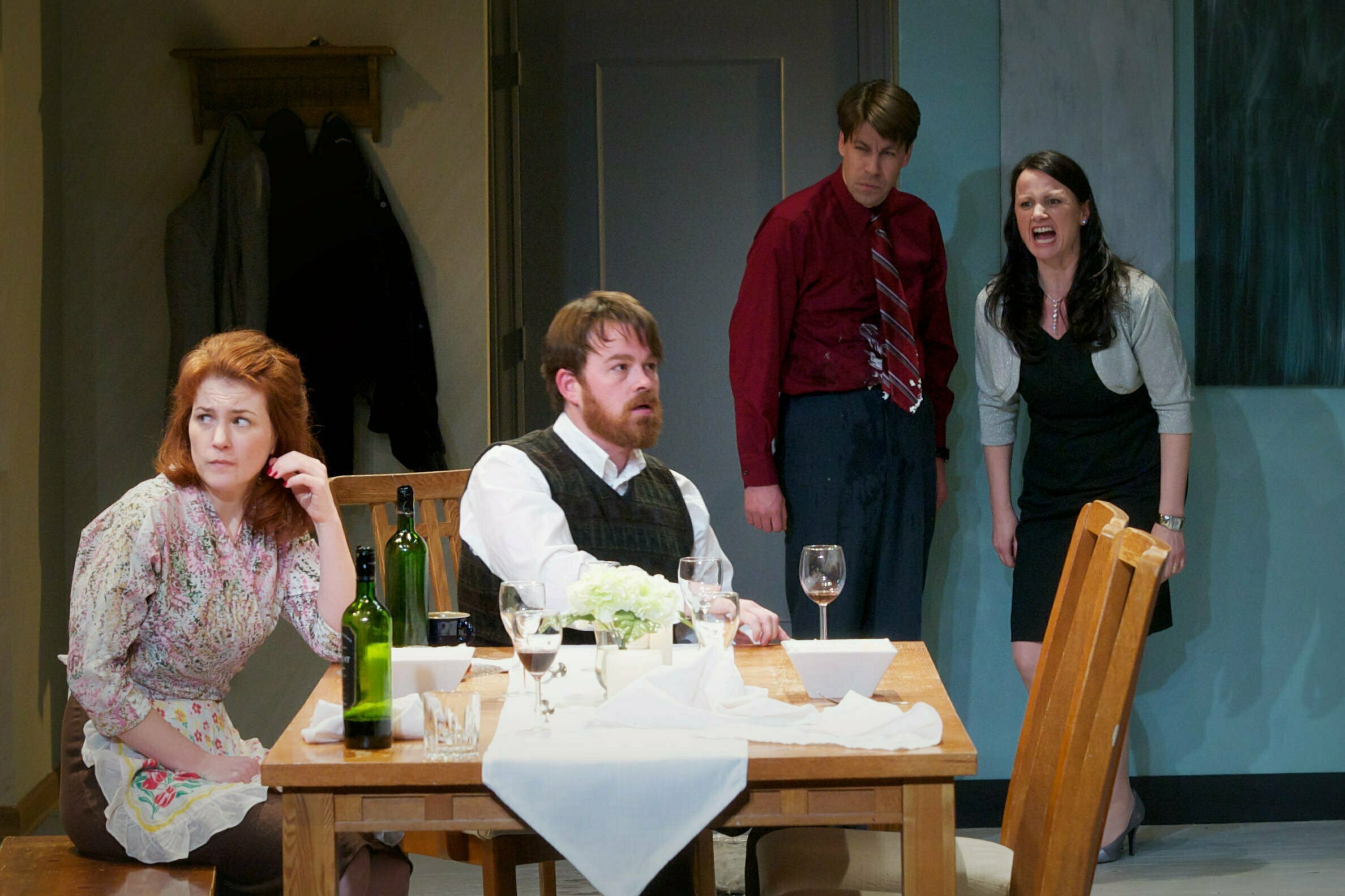 Seanachai Theatre Company (Equity troupe) follows their terrific production of The Weir with Irish playwright Gerard Stembridge’s wacky kitchen sink comedy, That Was Then. This is a contemporary tale of the simmering tensions beneath the surface between the Irish and the Brits told through a unique blend of theatricality that finds two kitchen/dinning room sets as the scene of two social/business meetings between an Irish and a Brit couples whose need for a loan reverses itself over time.