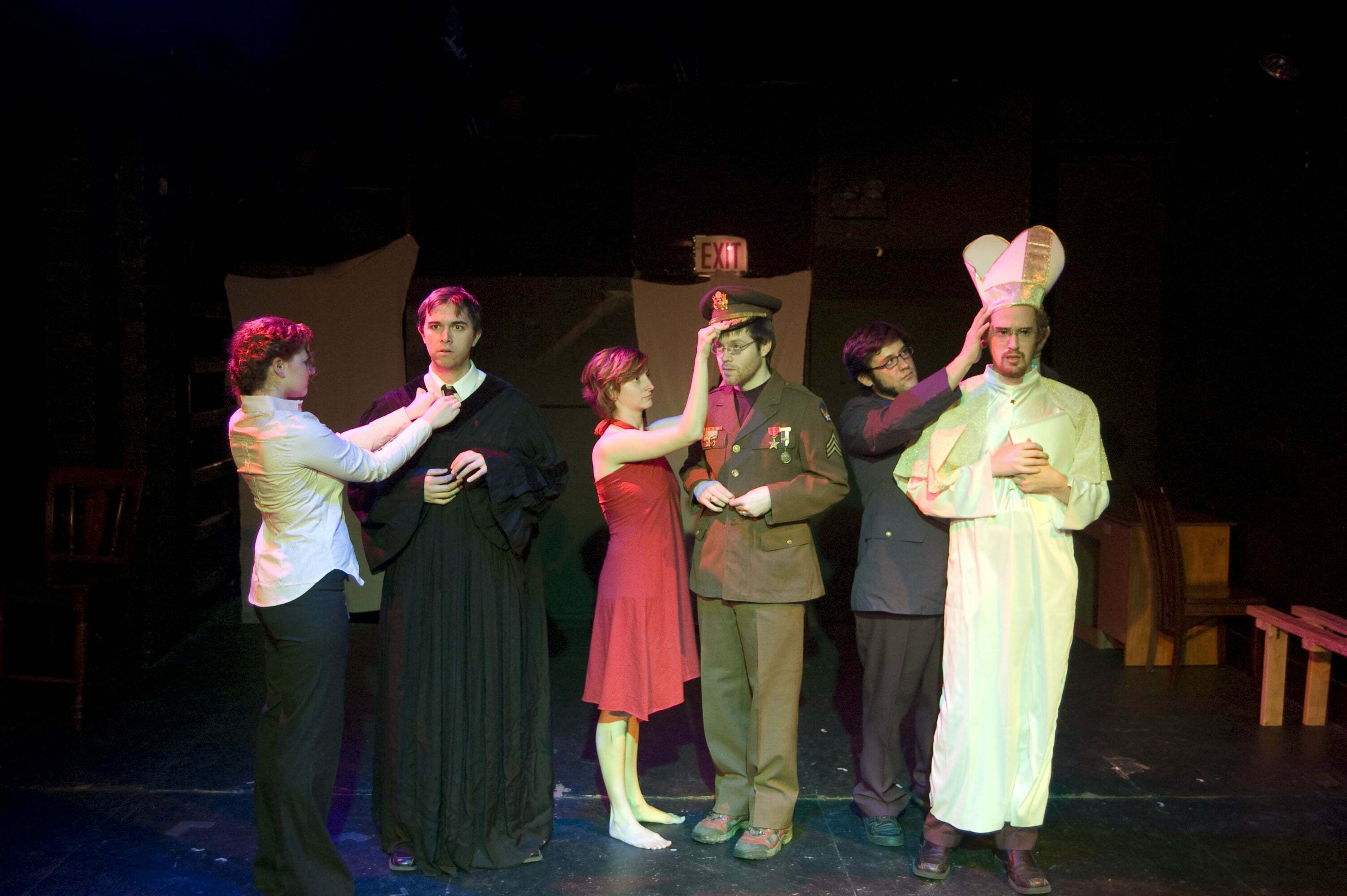 The new Goat Song Theatre has mounted an off-night (Monday, Tuesday and Wednesday) production of Jean Genet’s The Balcony, his rant on the contemptibly of society as seen through key political figures visiting to a brothel. Genet was obsessed with sex, revolution and prostitution. He mocks the roles key figures play in society as reality, role playing and illusion become obscured.
