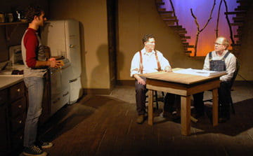 In The Drawer Boy, we meet two friends living and working a farm in 1972 rural Ontario. Angus (Will Kinnear) and his friend Morgan (Nick Polus) who run their farm through a harmonious daily ritual based on Morgan being the farmer and Angus being the cook, housekeeper and account. Tolerance, trust and routine rule their lives. They seem content until a young man-an actor- arrives at the farm asking to learn about farming by living and working with Morgan and Angus. Miles (Marco Minichielo) is researching farming for a play that his theatre company is contemplating.