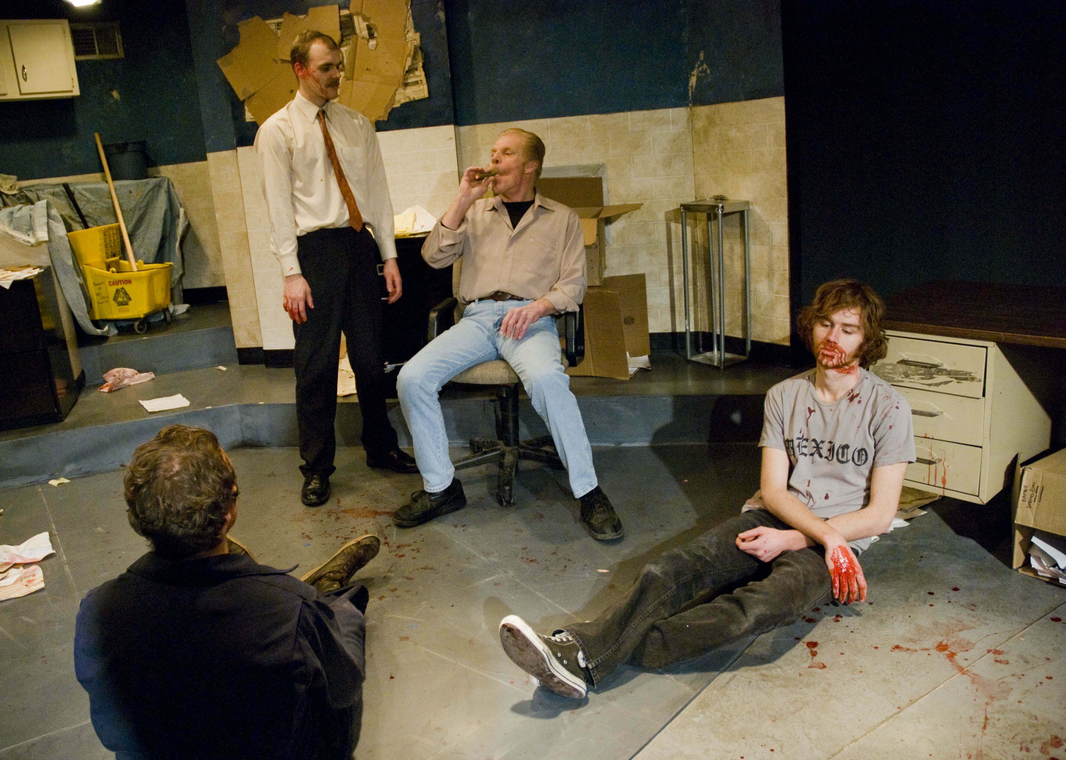 This 55 minute play seemed like 5 hours as the plot-less show depicts three dysfunctional brothers who can only relate to one another through highly ritualized violent games. Much of this show is a series of violent acts that finds the brothers trying to trick each other as they whack each other with a tire iron. They slap punch, stomp, and kick each other by the convoluted rules that change at the whim of the moment. There is loads of blood from nose, ear, head,and belly wounds inflicted through some smart stage combat.