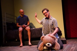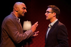 The 90 minute one-act open with David and Benjamin have dinner – David’s treat. They are celebrating Benjamin’s success.  Usman Ally plays David as a manic, emotional struggling playwright. He is glib, intelligent and intense. Benjamin is a laid-back,  confident and focused writer. Both have artistic aspirations.